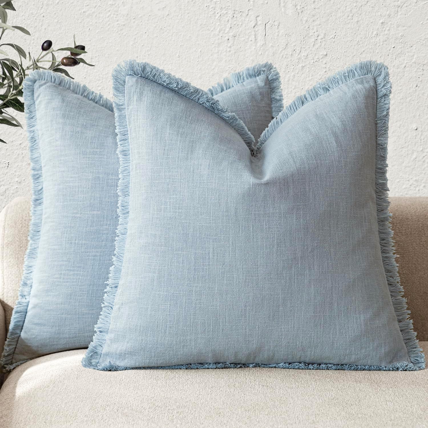Foindtower Set of 2 Decorative Linen Fringe Throw Pillow Covers Boho Farmhouse Cushion Cover with Tassels Soft Accent Pillowcase for Couch Chair Sofa Bed Living Room Home Decor,16×16 Inch,Sky Blue