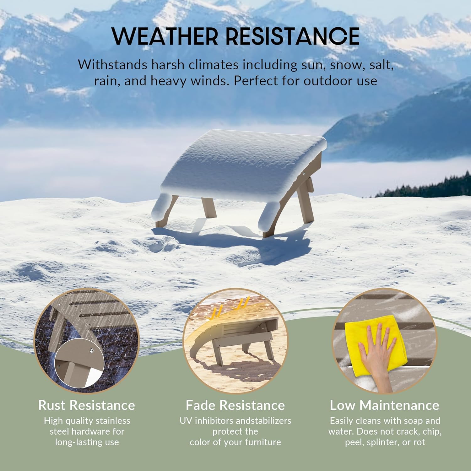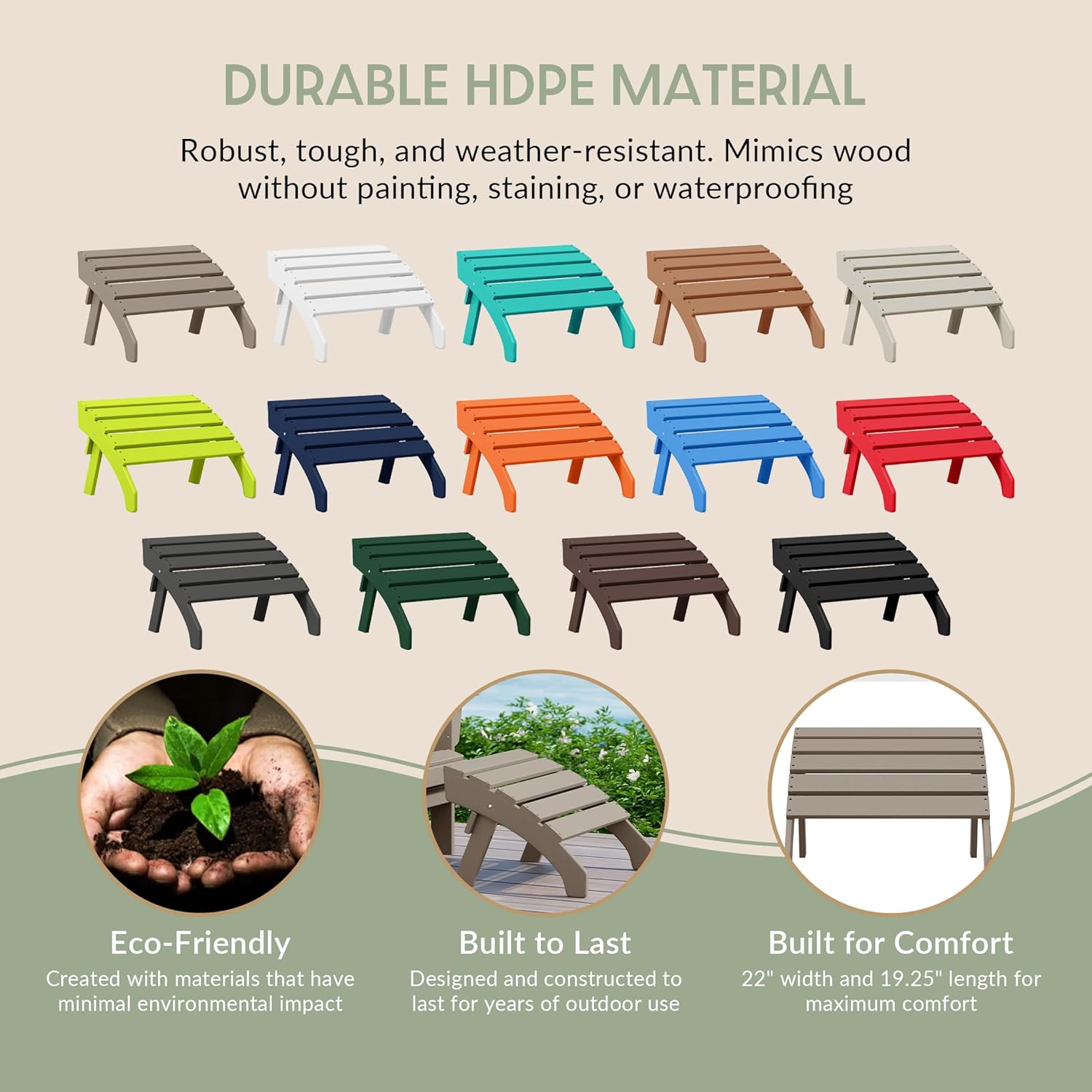 - All Weather Resistant: This Adirondack foot rest are made of HDPE plastic, its weather resistant and UV fade resistant material can withstand in various enviromental pressure and not easy to dent, crack , peel or rot as wood.