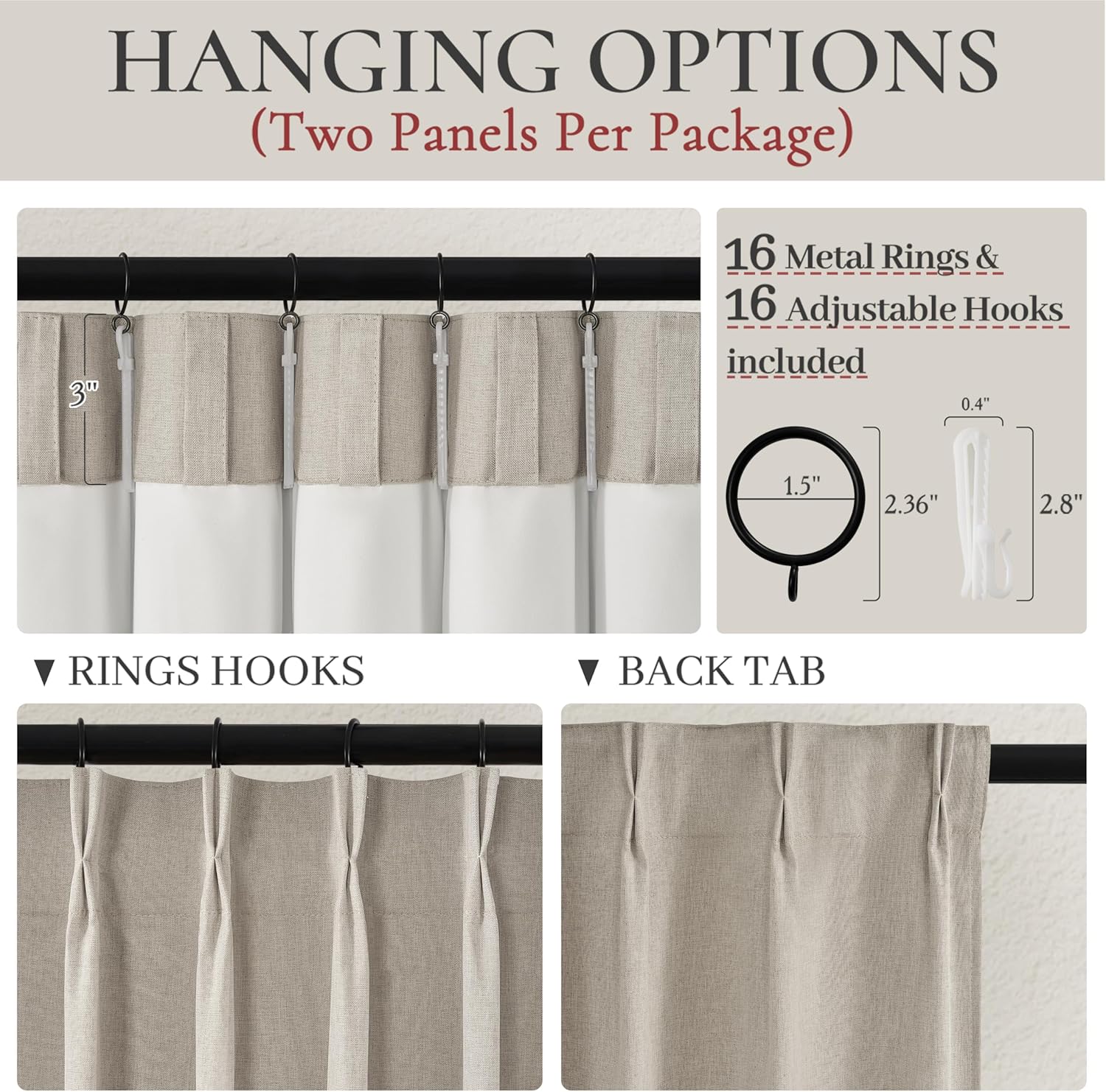 - Multiple Hanging Ways:3 hanging options to meet different home decor.1:Hanging with hooks on rings or track to easy slide (hooks,rings are included).2:Using back tab to hide the rod,easy to hang and hide the rod.3:Using clip rings(clip are not included)