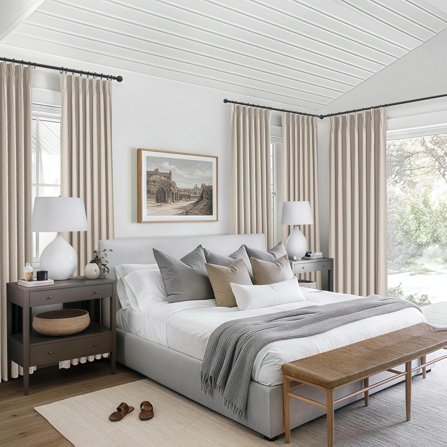 - Pinch Pleats Design:Each panel has 7 pleats.linen draperies are crafted from blended fabric(30%linen,70%polyester),drapes well and not easy-wrinkle.Suitable for various styles:modern,farmhouse,boho,neutral,bedroom,living room,nursery,sliding door,etc.