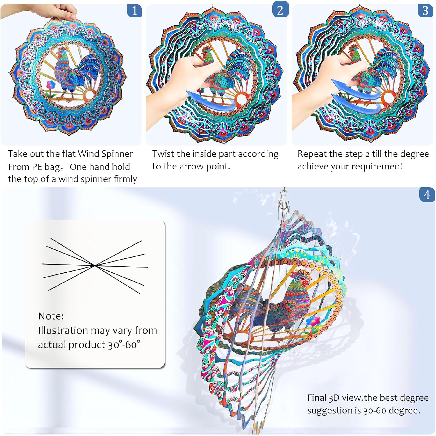 - ★【Fascinating 3D Reflective Wind Spinner】12 inch colorful yard art rooster wind spinner follows the trendy kinetic art design style. The wind spinners hanging can rotate 360°,creating a magical 3D stereoscopic visual effect by different colors on the surface,Reflective gilt powder material gives off a sparkling,like a beam of sunlight through the night and bringing you strength,courage and vitality,add captivating and magical visuals and bring stunning views to your home,garden and yard.