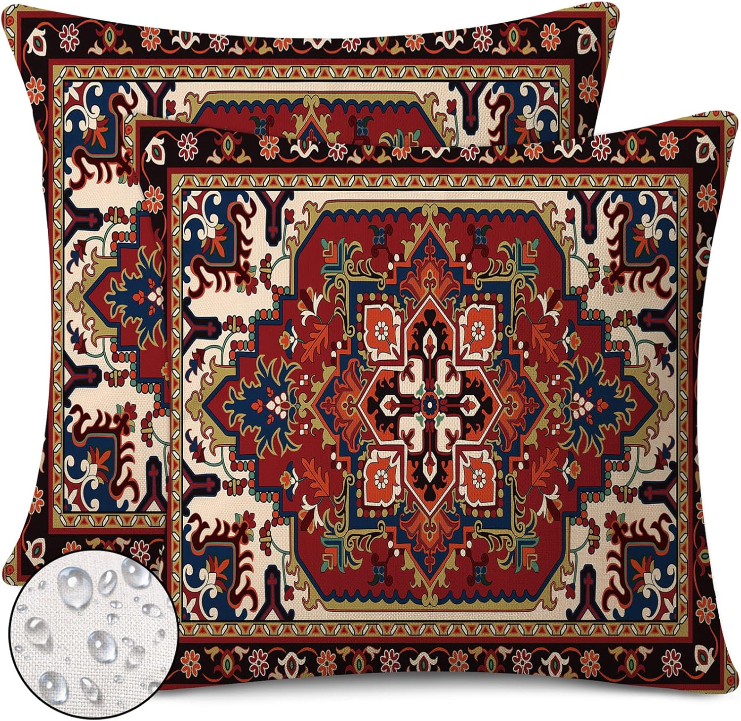 Outdoor Waterproof Pillow Covers 18x18 Inch Red Floral Bohemian Vintage Carpet Pattern Ethnic Design Decorative Farmhouse Cushion Cases for Sofa Couch Garden Balcony Set of 2