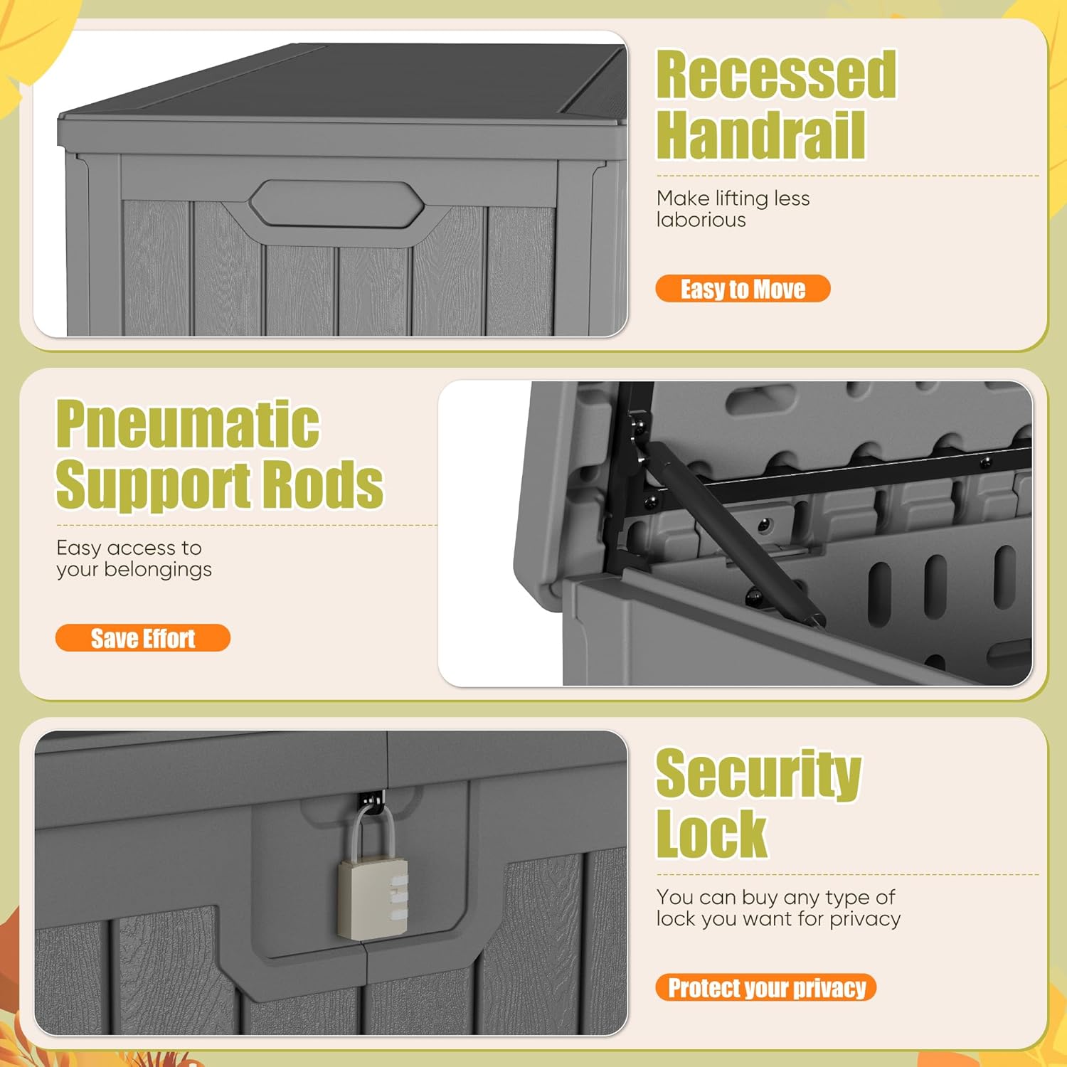 - Function Design: Equipped with two pneumatic support rods, it can be easily opened and slowly closed to safely access your items and provide you with protection. Lockable lid ensures your items are more secure.