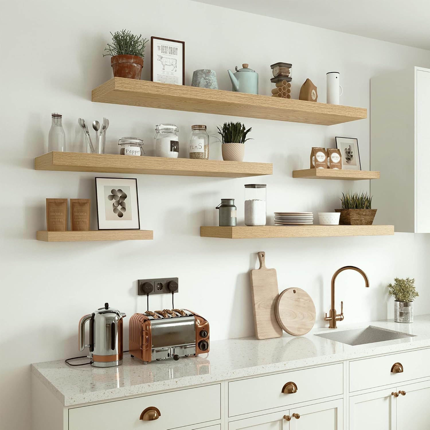 - Well-designed Floating Shelves - The rustic style floating shelves combining both practicality and style. These shelves offer a generous deeper and thicker surface, perfect for organizing daily sundries without taking up valuable floor space. The various of selected colours finish adds a cozy, natural element,display your art pieces on the wall to decorate your home, and make it full of aesthetic flare.