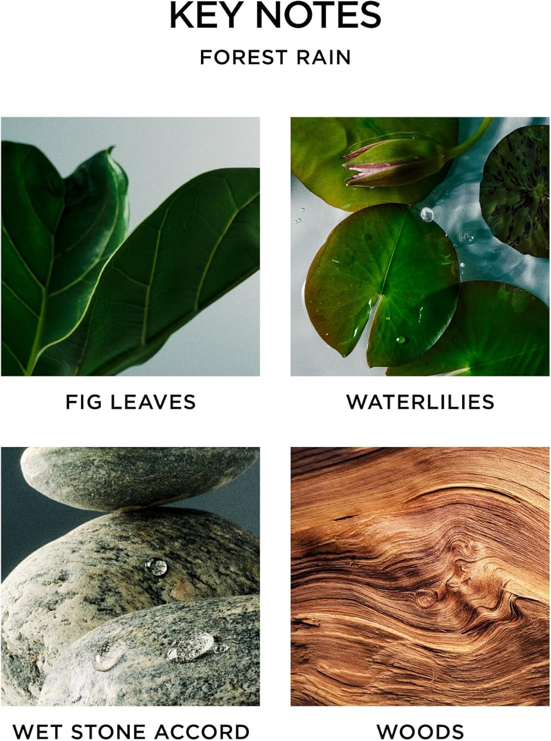 - FRESH - Dewy fig leaves wrapped in an aquatic veil of waterlilies evoke the cleansing feeling of a lush green forest in a downpour. Grounded in earthy woods and cooling wet stones, this scent encapsulates the transformative essence of rain.