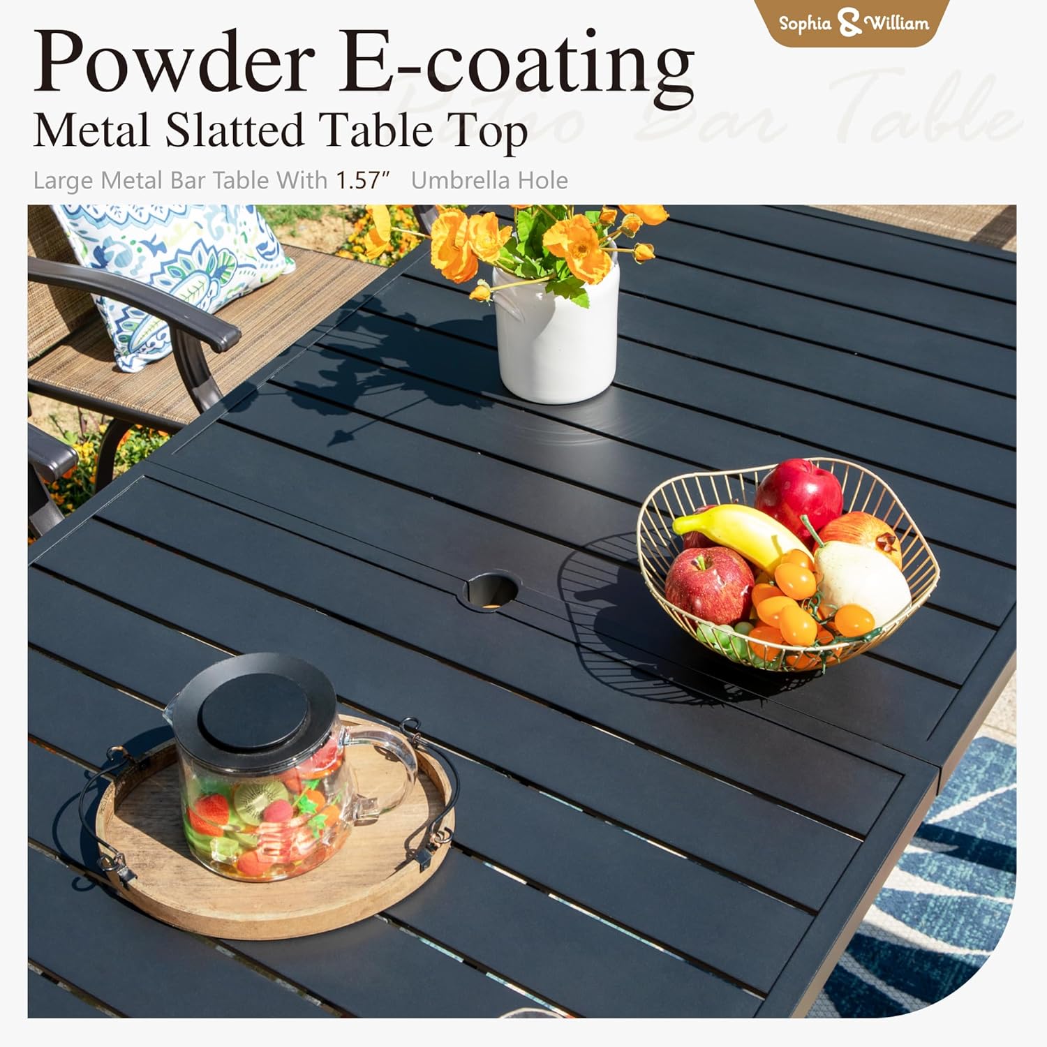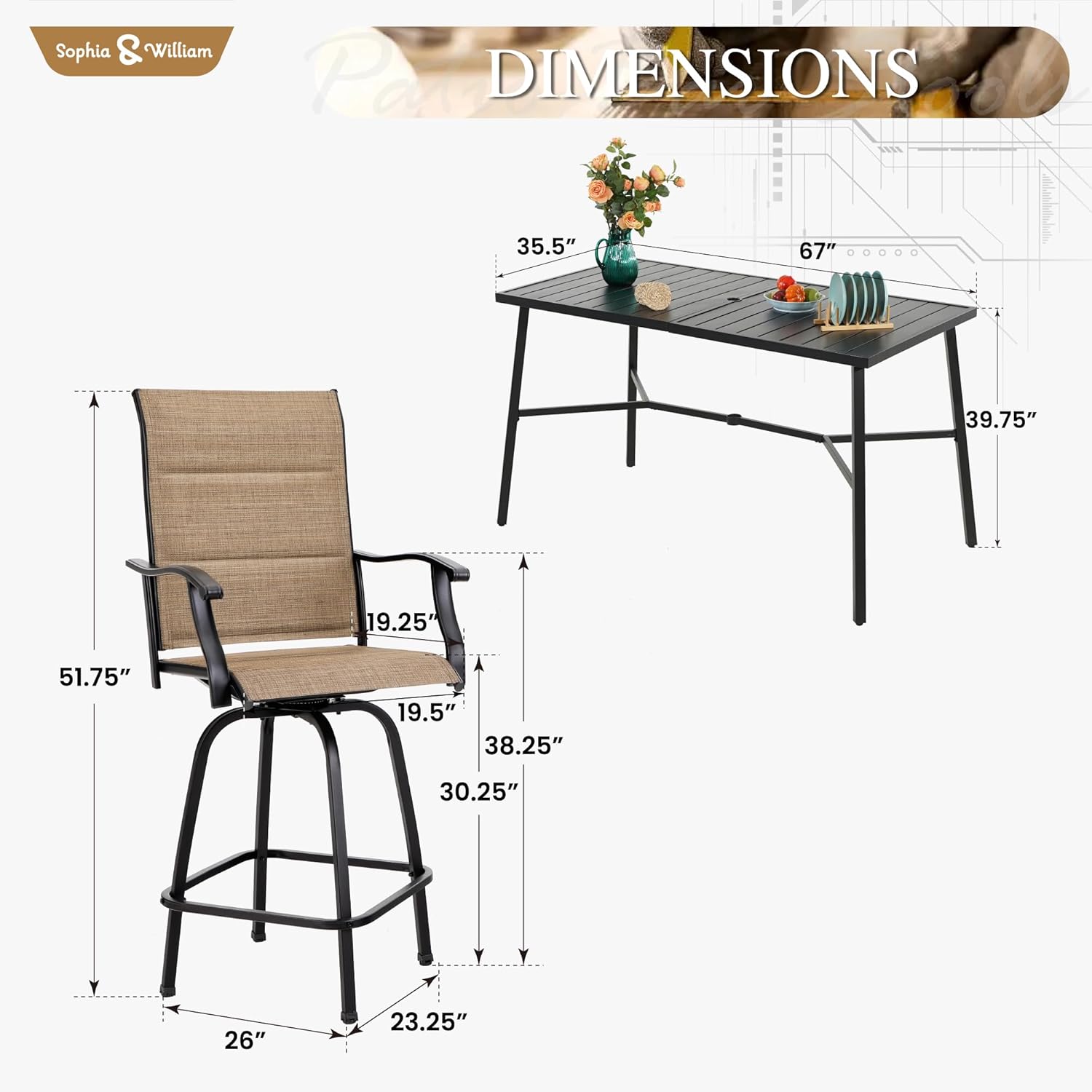 - Barheight Patio Table and Chairs:Combines ergonomic high back design with seamless swivel functionality, this bar set provides a stylish and elevated seating option that adds flair to any space. Patio bar table features a classic and neat tabletop with 1.57 umbrella hole
