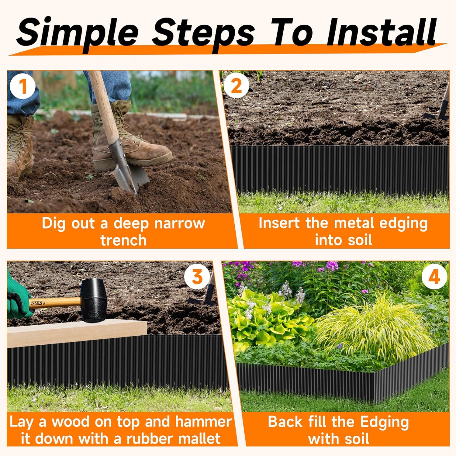 - Easy Installation Installing this lawn edging is quick and simple. Wet the soil for easier setup, then gently push it into the ground or use a rubber mallet. For harder soils, dig a narrow trench, place the edging, and backfill. These steel edging can be cut with metal scissors for custom lengths—Wear your cut resistant gloves for safer installation.