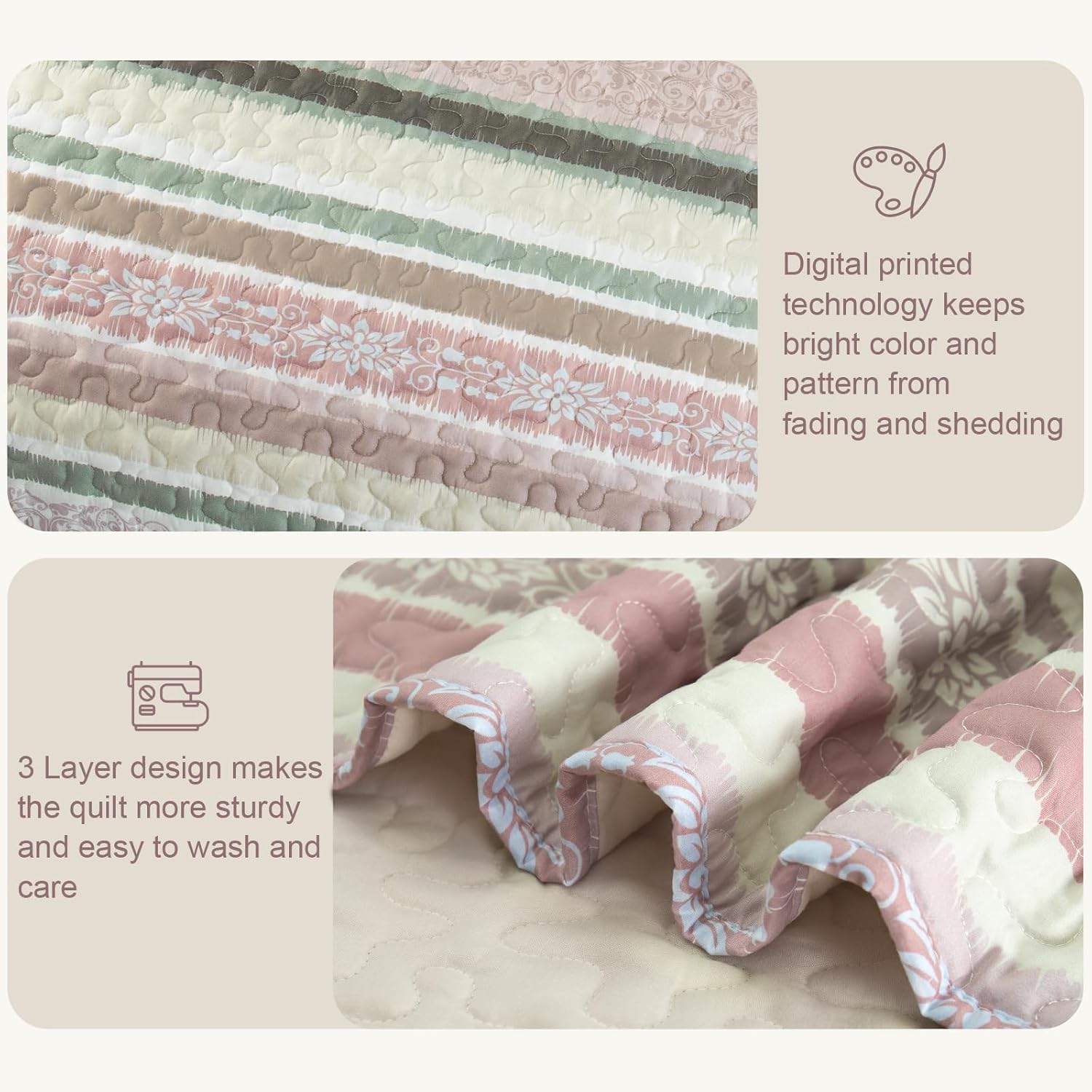- Design: Pastel striped patterns are carefully printed on this quilt bedding set. Thanks to the high-tech digital print technology, this bed cover could keep its vibrant colors and patterns from fading after washing