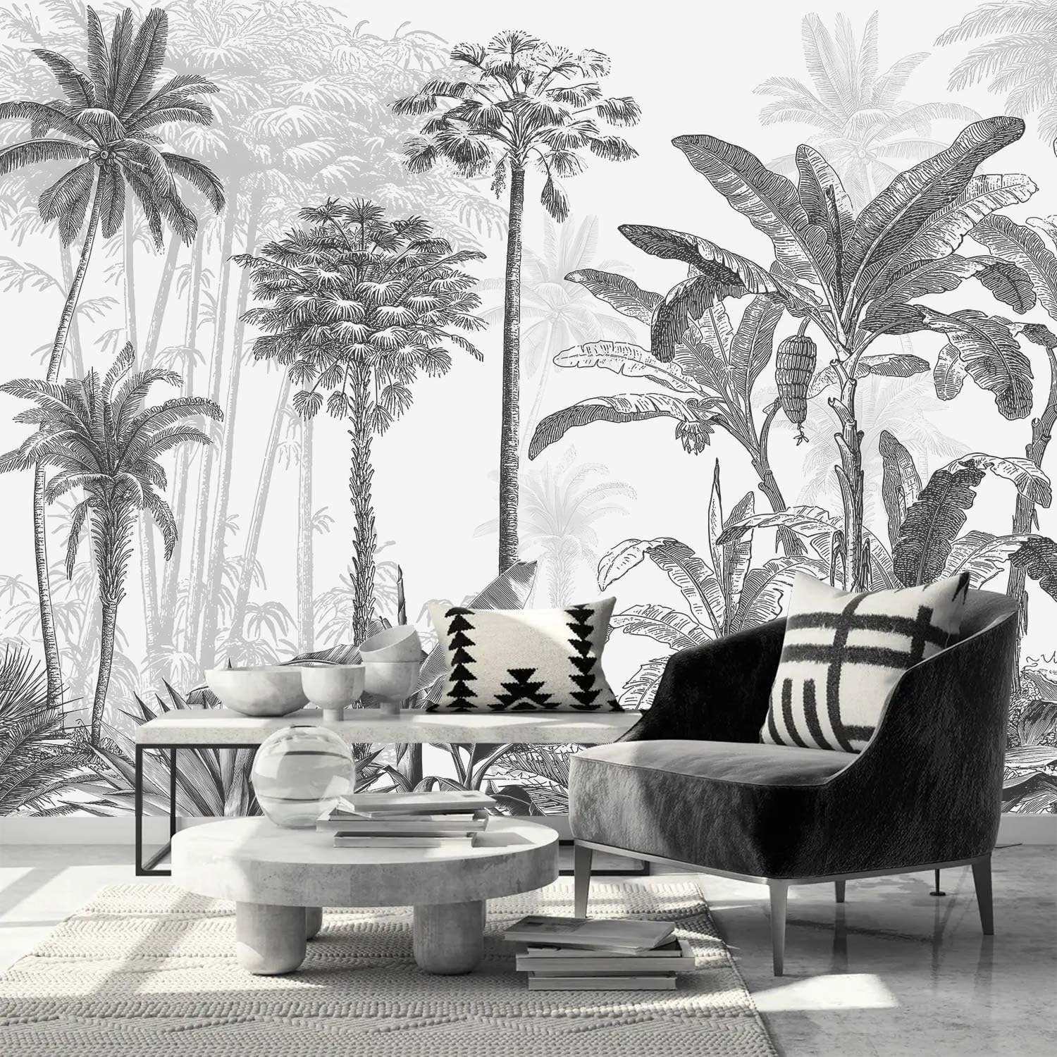 AFZEVEB-Black and White Jungle Wallpaper Hand-Painted Tree Wall murals for Bedroom 114"x74" (Not Peel and Stick)