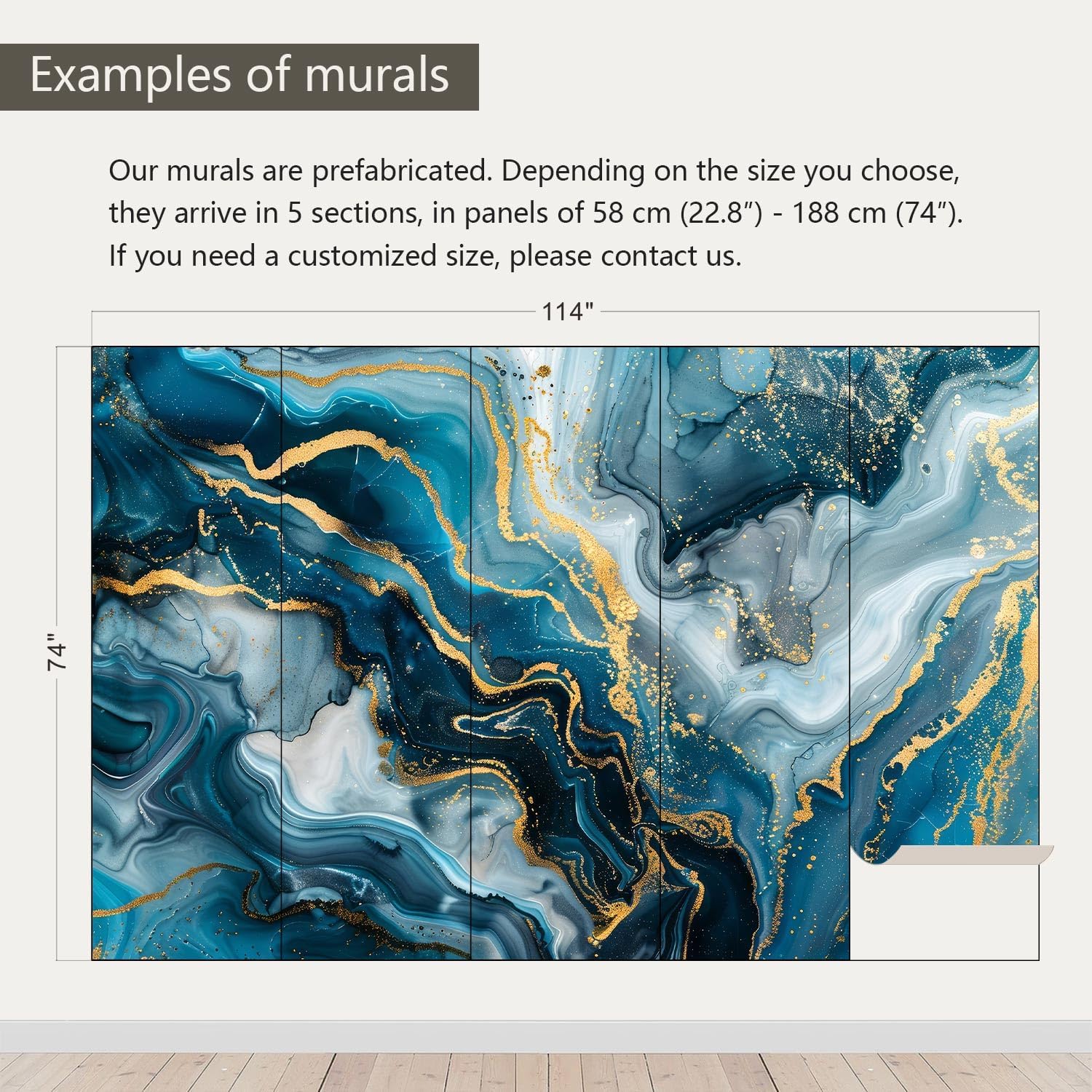 - Size note: Mural measures 114"W x 74"H and is divided into 5 sections, each section is labeled with a number underneath, eliminating the need to overlap patterns when installing.