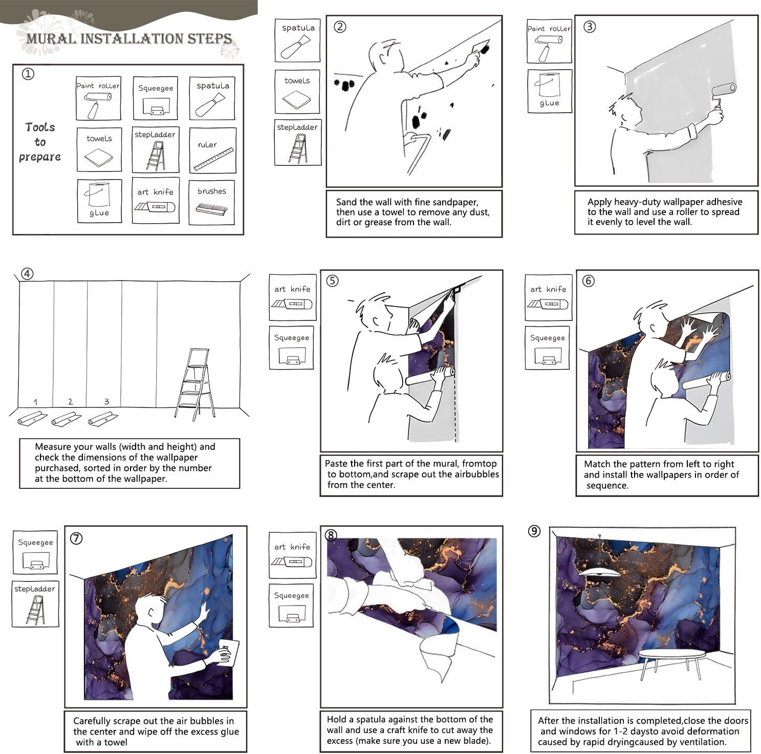 - Tips: Mural can not be peeled and pasted, you need to buy a heavy duty wallpaper glue