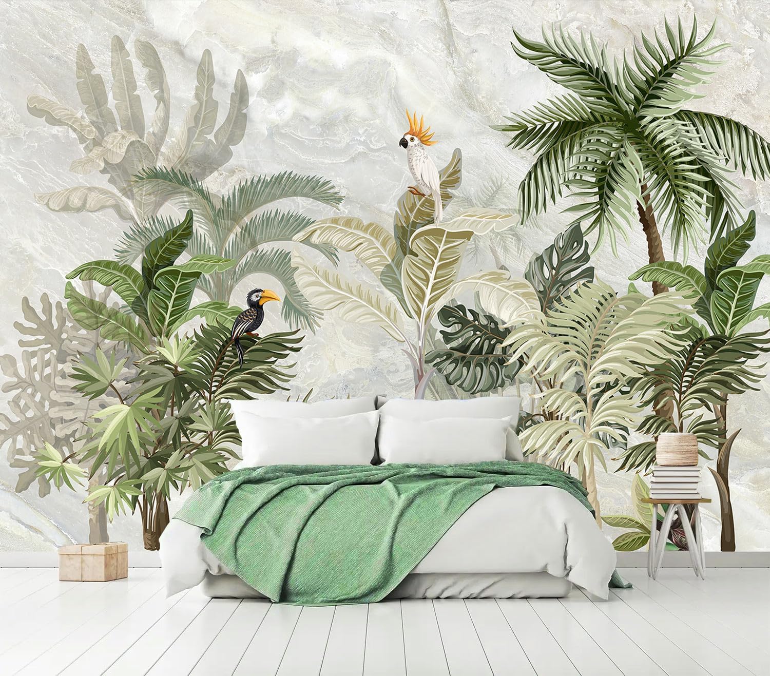 AFZEVEB-Green Forest Nursery Wallpaper Tropical Parrots Wall murals for Kids Room 114"x74" (Not Peel and Stick)