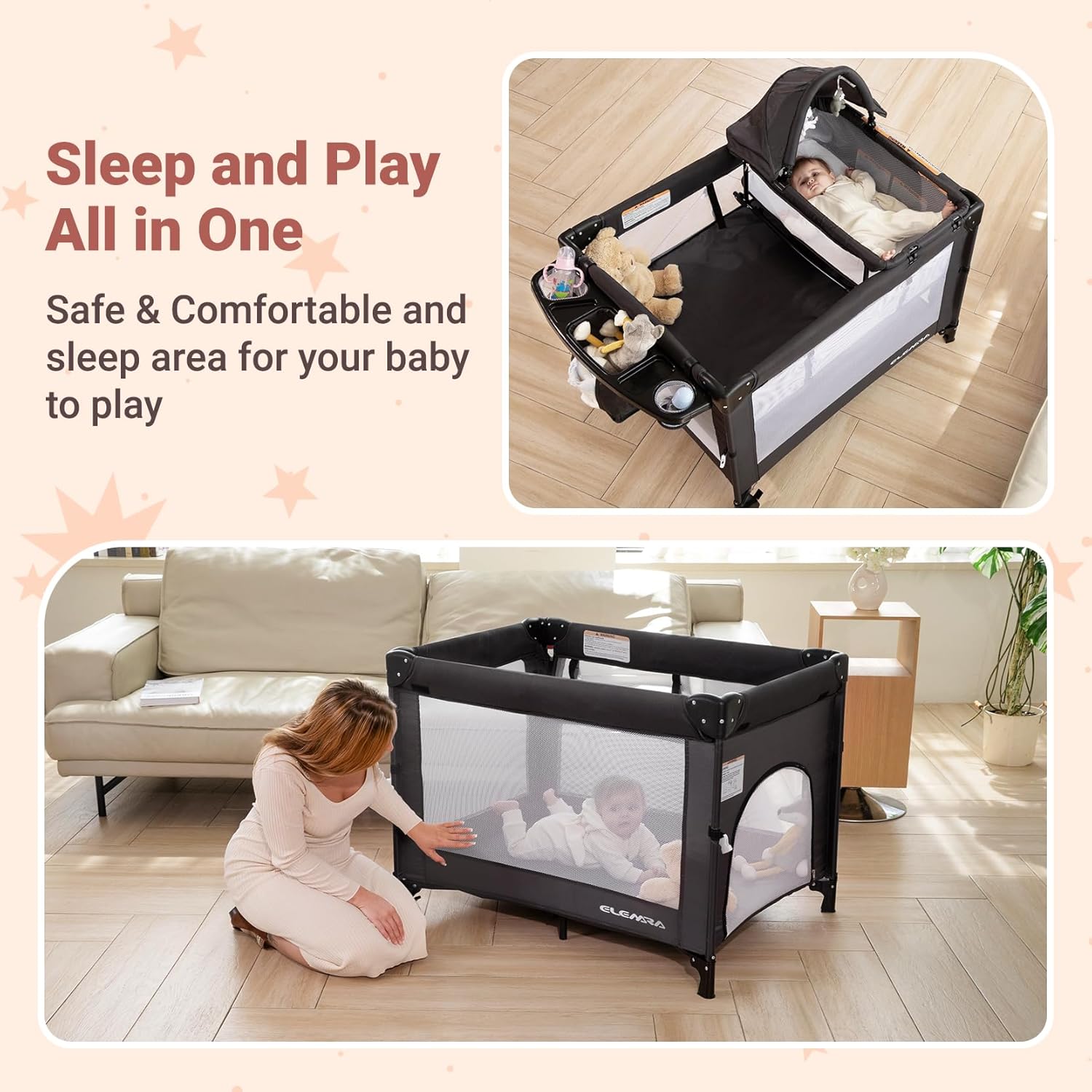 - 👶【5-in-1 Multifunctional Design】This 5-in-1 crib Combines bassinet, playpen, diaper changing table,portable travel bassinet, and play center and side zipper to meet the whole transformation grow up process of 0-3 years old babies