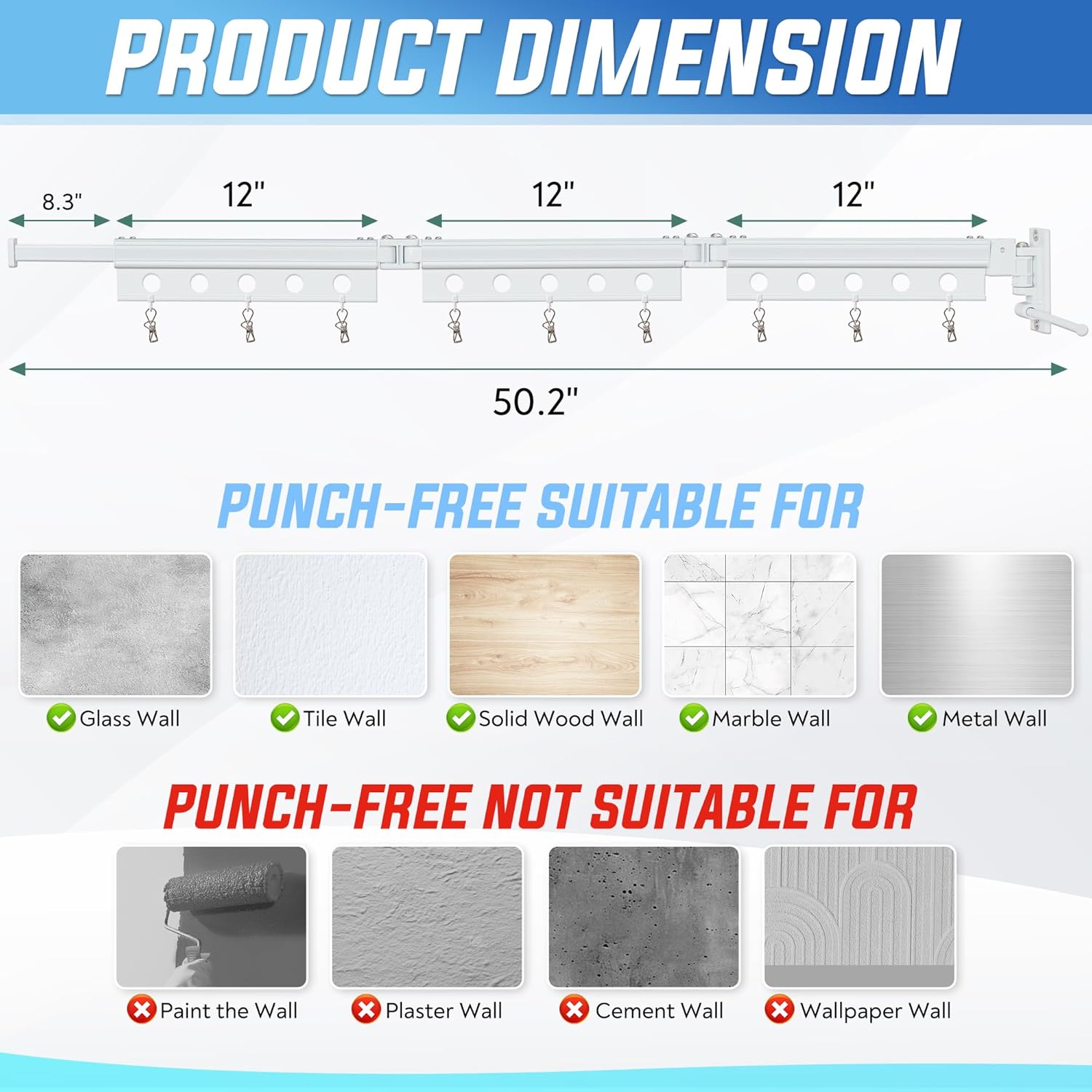 - Wall Mounted Clothes Drying Rack Foldable - 50.2 Inch Maximize Space with 3 Folding Sections and Hidden Telescopic Rod Ideal for Drying Shirts Towels Socks Hats Coats Suits Dresses and More Includes 10 Clothespins Compact Stylish Design for Laundry Room Organization