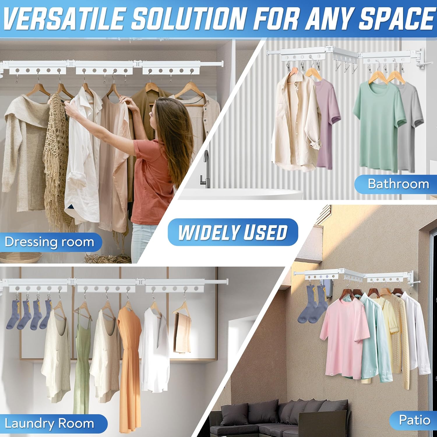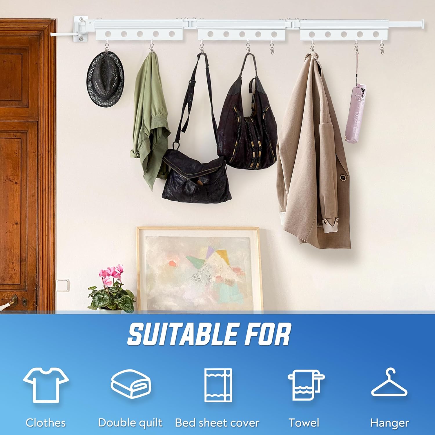 - Premium Material & Craftsmanship -- Crafted from space aluminum, our clothes drying rack wall mounted ensures long-lasting durability without rusting. Its multi-layered paint protection guarantees resistance to acids, alkalis, rust, and corrosion, ensuring robust performance over time.