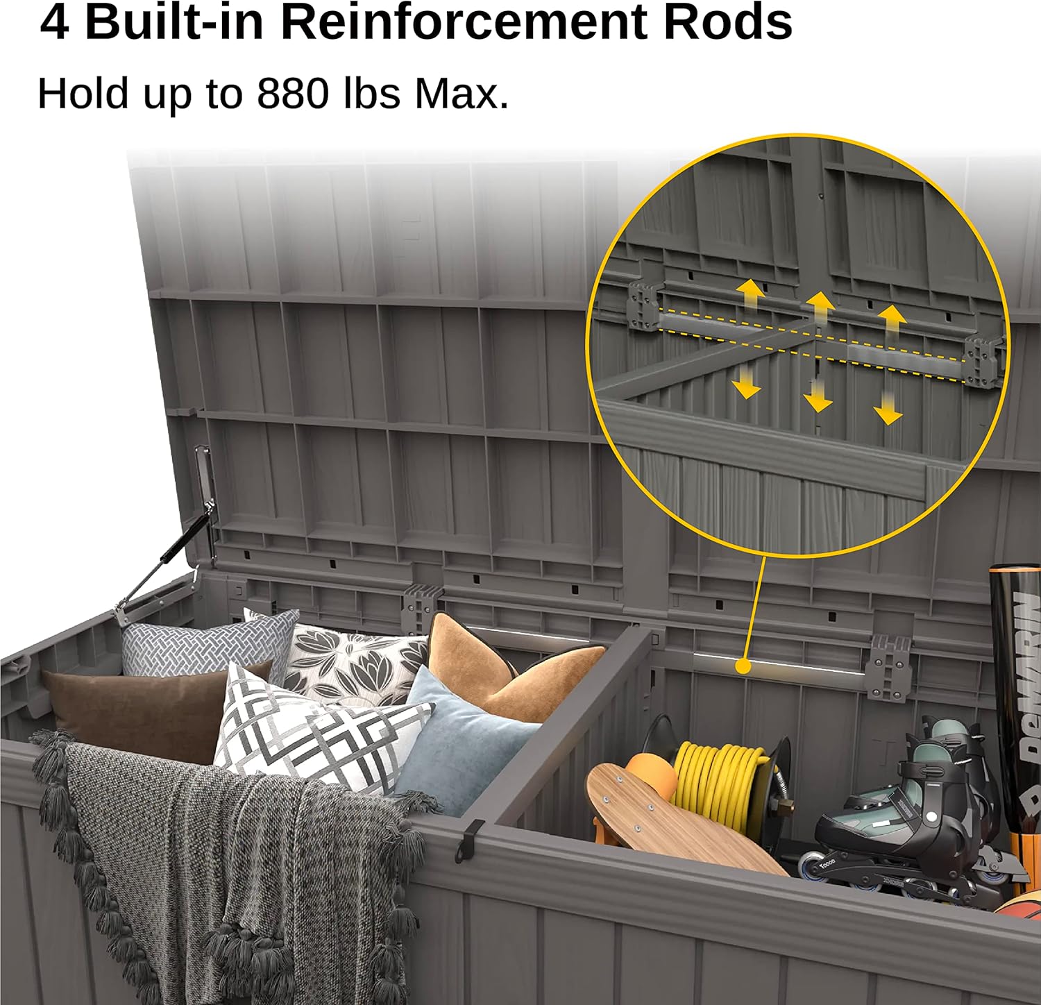 - ππ¨π₯ππππ ππ‘π ππ’π‘π-πππ¦π§ππ‘π: Crafted from weather-resistant resin, this deck box resists rust, peeling, and denting, offering greater longevity than wooden alternatives. Equipped with 4 built-in reinforcing rods, it maintains its shape even after prolonged sun exposure.