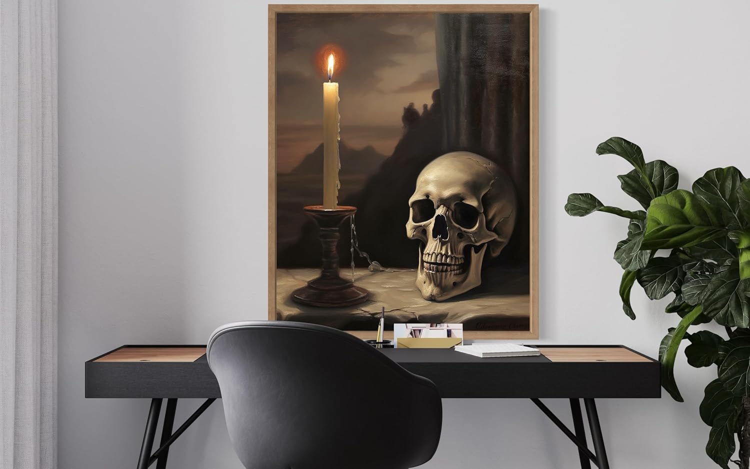 Skull and Candle Poster Art Print, Halloween Scary Vintage Wall Art Academia Spooky Painting Decoration for Horror Prints, Gothic Posters Bedroom Decor 89 (Skull and Candle, 8 x 10 inches, Wood Frame)