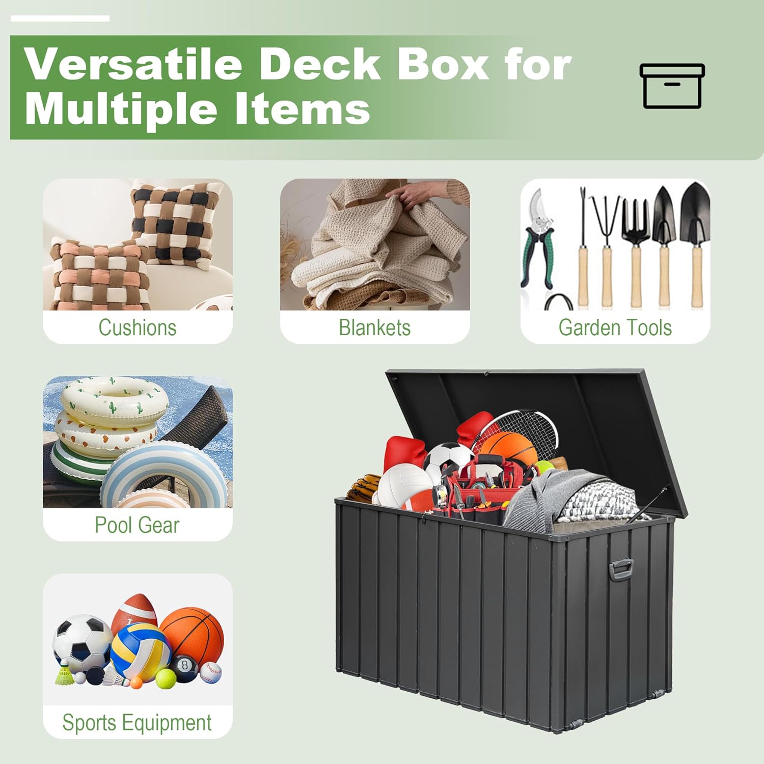 - Diverse Storage: This storage container can hold a variety of items, such as pillows, cushions, garden tools, and sports equipment. It helps save space while keeping your belongings organized and easy to access.