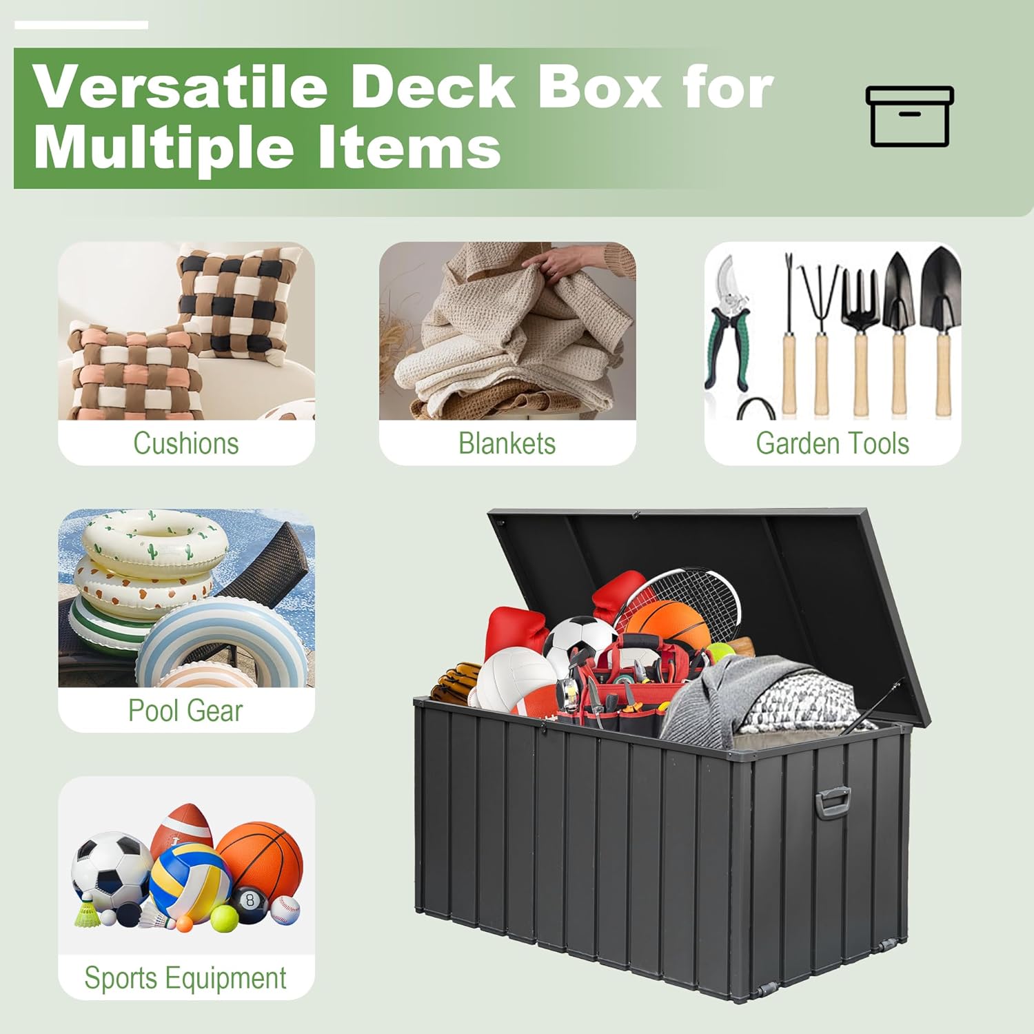 - Diverse Storage: This storage container can hold a variety of items, such as pillows, cushions, garden tools, and sports equipment. It helps save space while keeping your belongings organized and easy to access.
