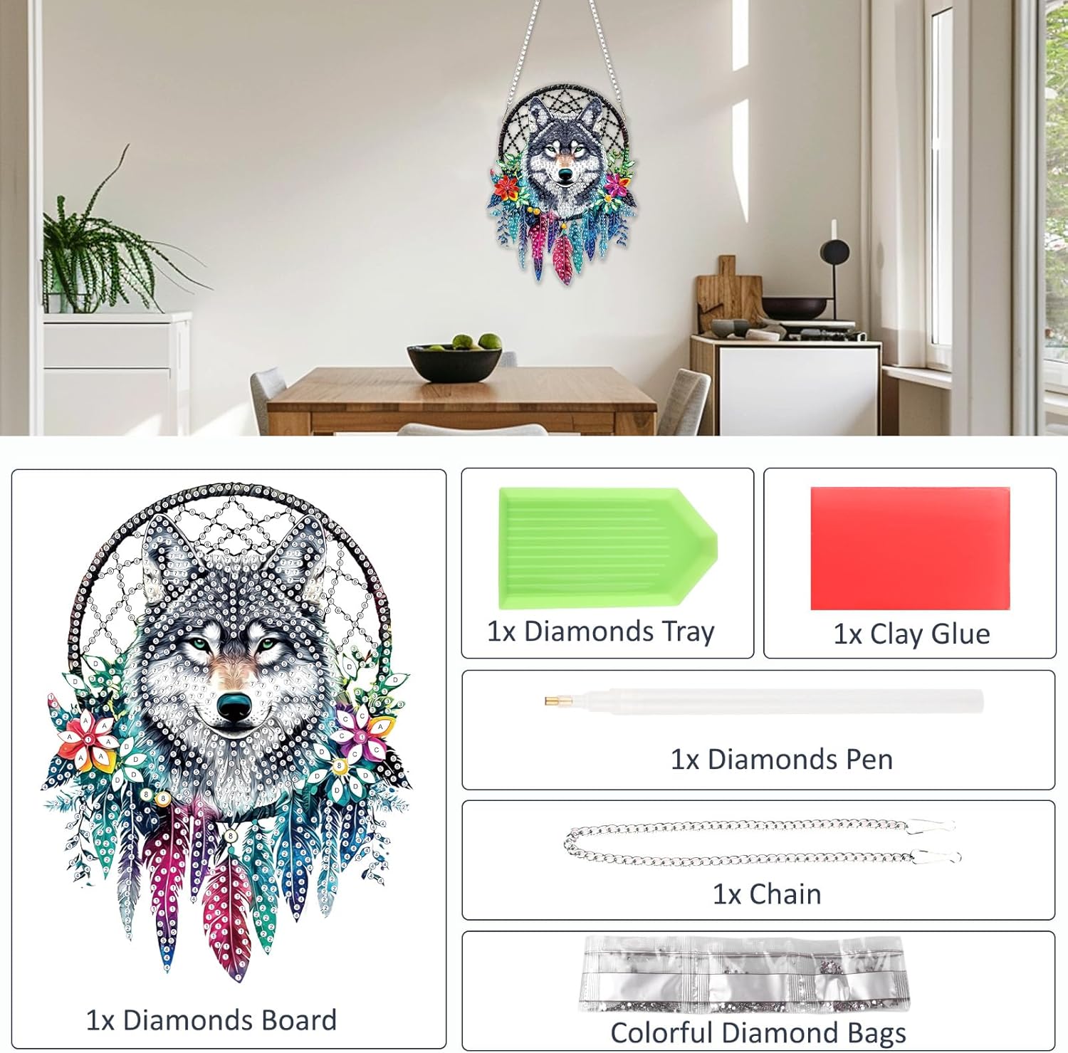 - Diamond Painting Kit Include: Package comes with enough colorful diamonds, diamond hanging plate x1, iron chain x1, point diamond pen x1, cube x1, diamond tray x1, red glue clay x , with beautifully crafted boxes, providing everything needed for art completion
