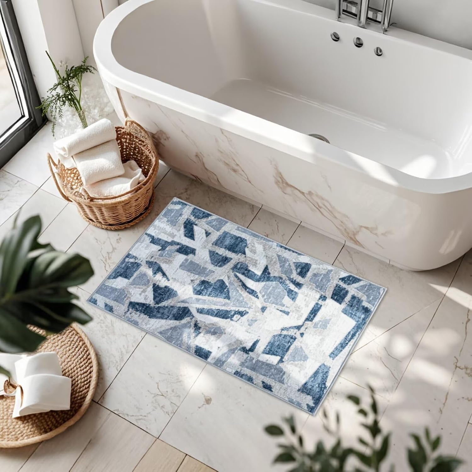 Modern Abstract Door Mat Indoor Entrance 2X3 Blue Rug Washable, Non-Slip Small Rugs for Entryway Bathroom Ultra-Thin, Throw Carpet for Kitchen Bedroom Nursery Kids Print Faux Wool