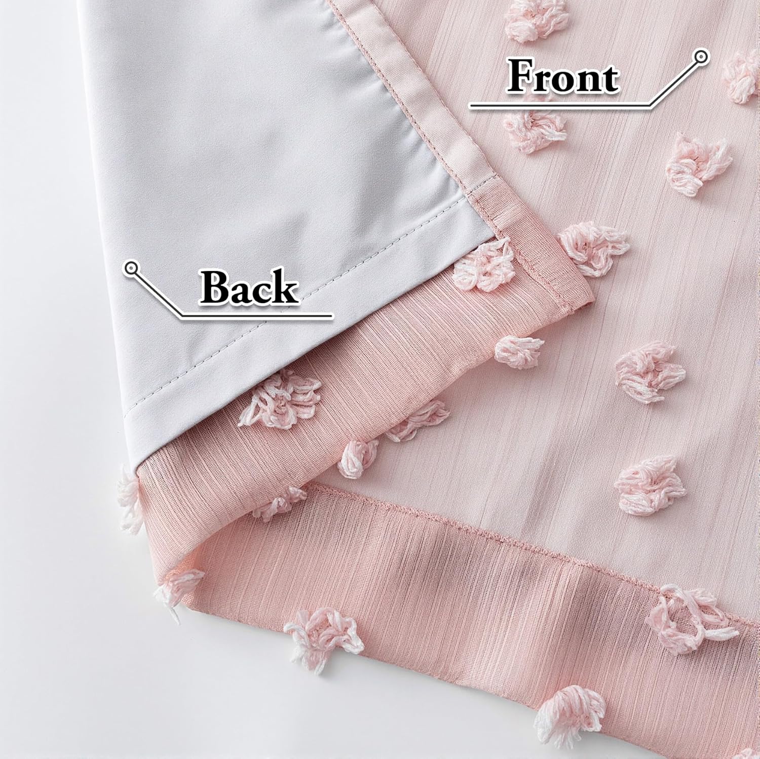 - Basic Information: 2 panels of 100% blackout curtains with pom pom sheers, each panel measures 52 Inches wide by 95 Inches long, total 104 inches wide.