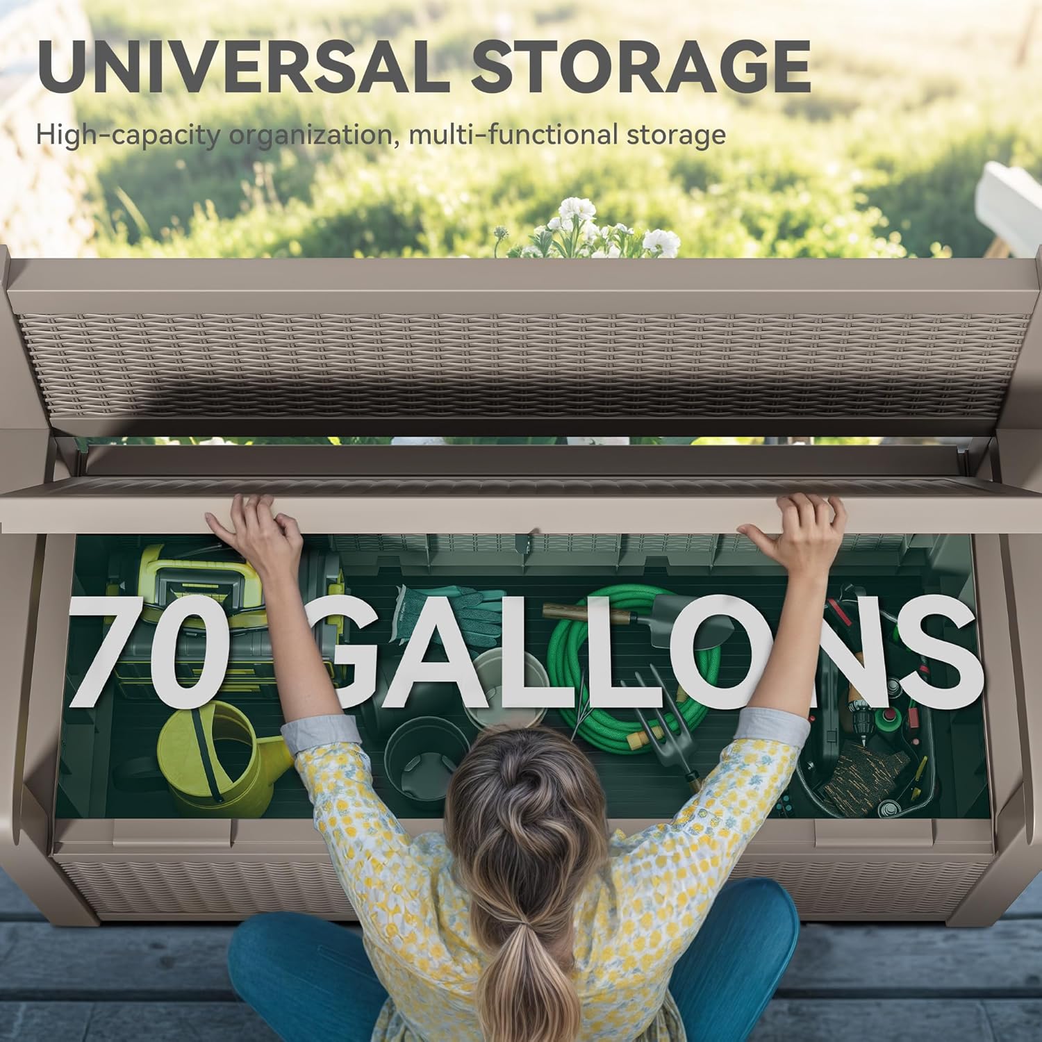YITAHOME 70 Gallon Deck Bench with Storage, Outdoor Storage Box Bench with Armrests for Patio Garden Pool Porch, Waterproof&Lockable, Light Brown