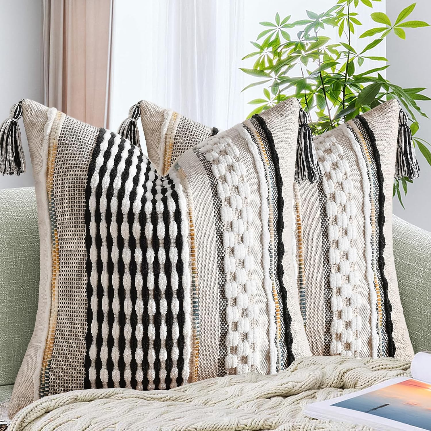 AmHoo Set of 2 Chenille Striped Textured Boho Throw Pillow Covers Aesthetic with Tassels Woven Decorative Pillow Case for Couch Bed Sofa Bedroom Modern Funky 18 x 18-Inch Black