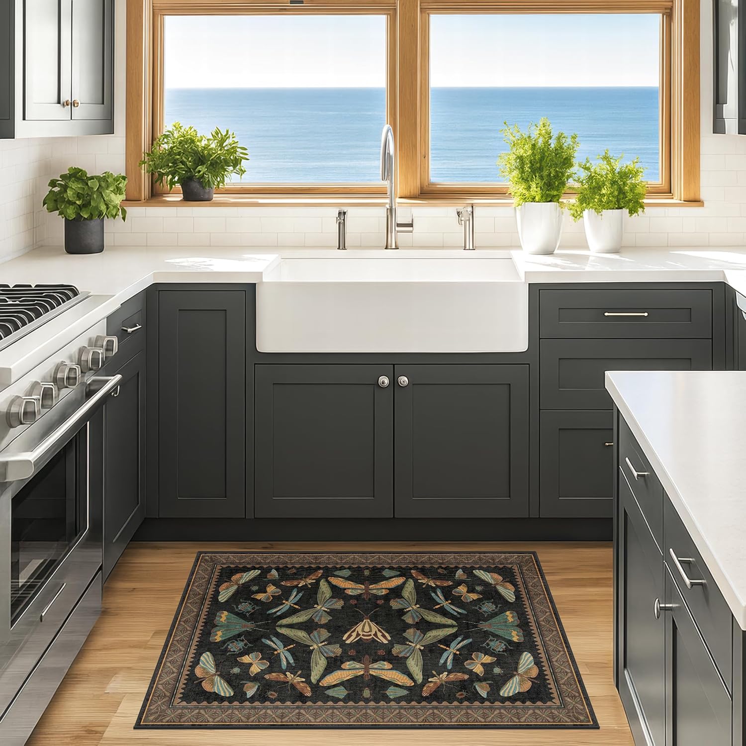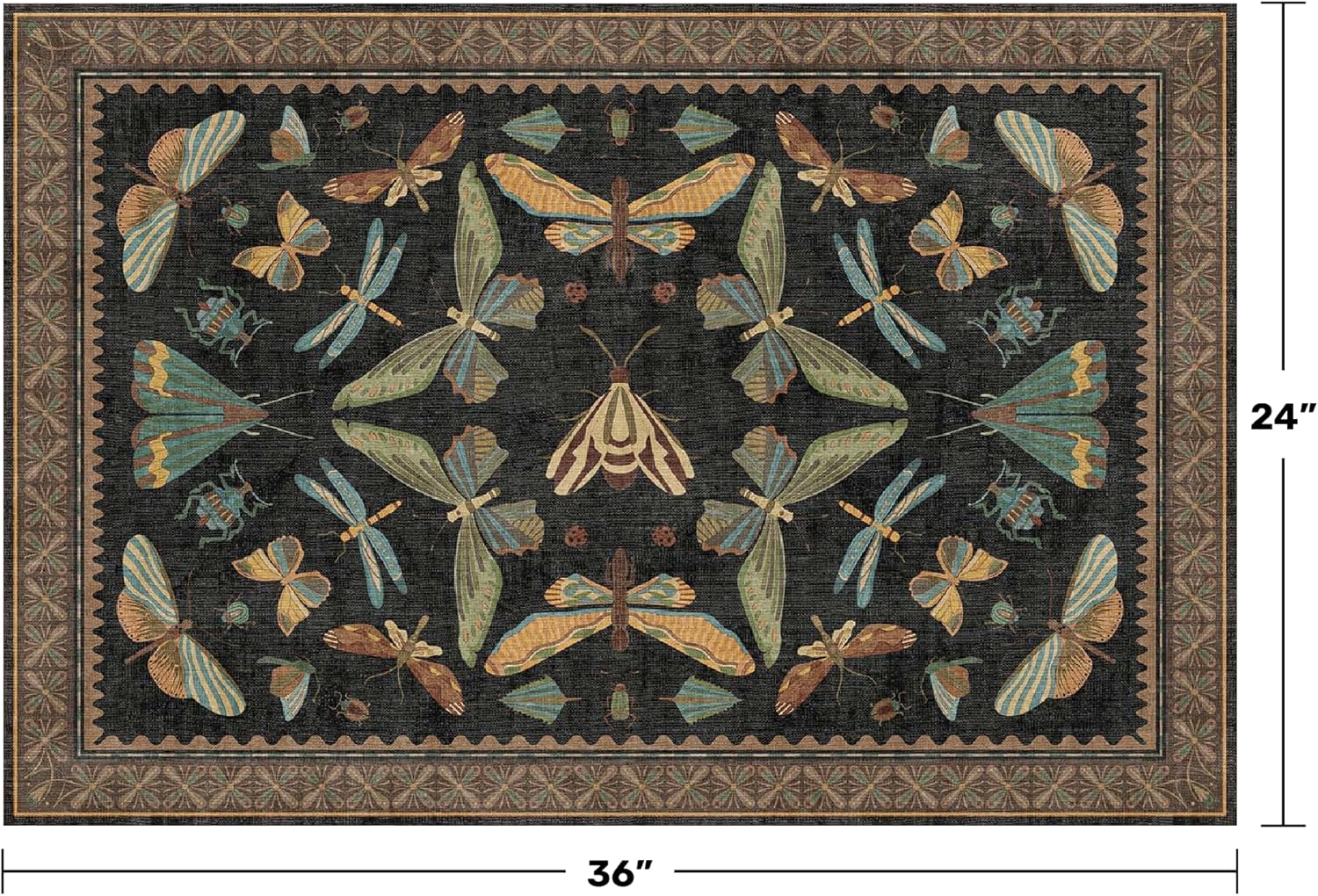 - Eclectic Vintage Charm: Make a bold statement with this insect-themed area rug, set against a black and brown background. Intricate illustrations of moths, butterflies, and dragonflies shine. Earthy tones of mustard, teal, sage green, rust, and pale blue give a warm, vintage feel. The symmetrical arrangement and scalloped interior edge bring to mind classical natural history art, while the stylized floral border adds a handcrafted touch. Ideal for antique, boho, or cottage-inspired interiors