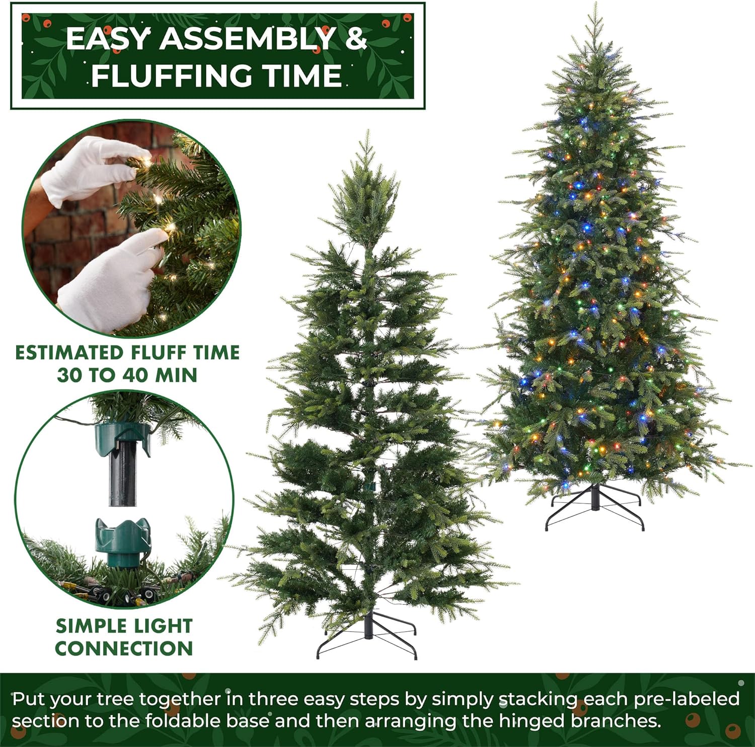 - Easy assembly and takedown: Features a cordless light system for hassle-free setup. Assemble in three simple steps: stack each pre-labeled section onto the base, arrange the hinged branches, plug in the tree. For the fullest and most natural appearance, set aside 45–60 minutes to shape the tree. Simply pull down and arrange the branches to your preference, with the included protective gloves.