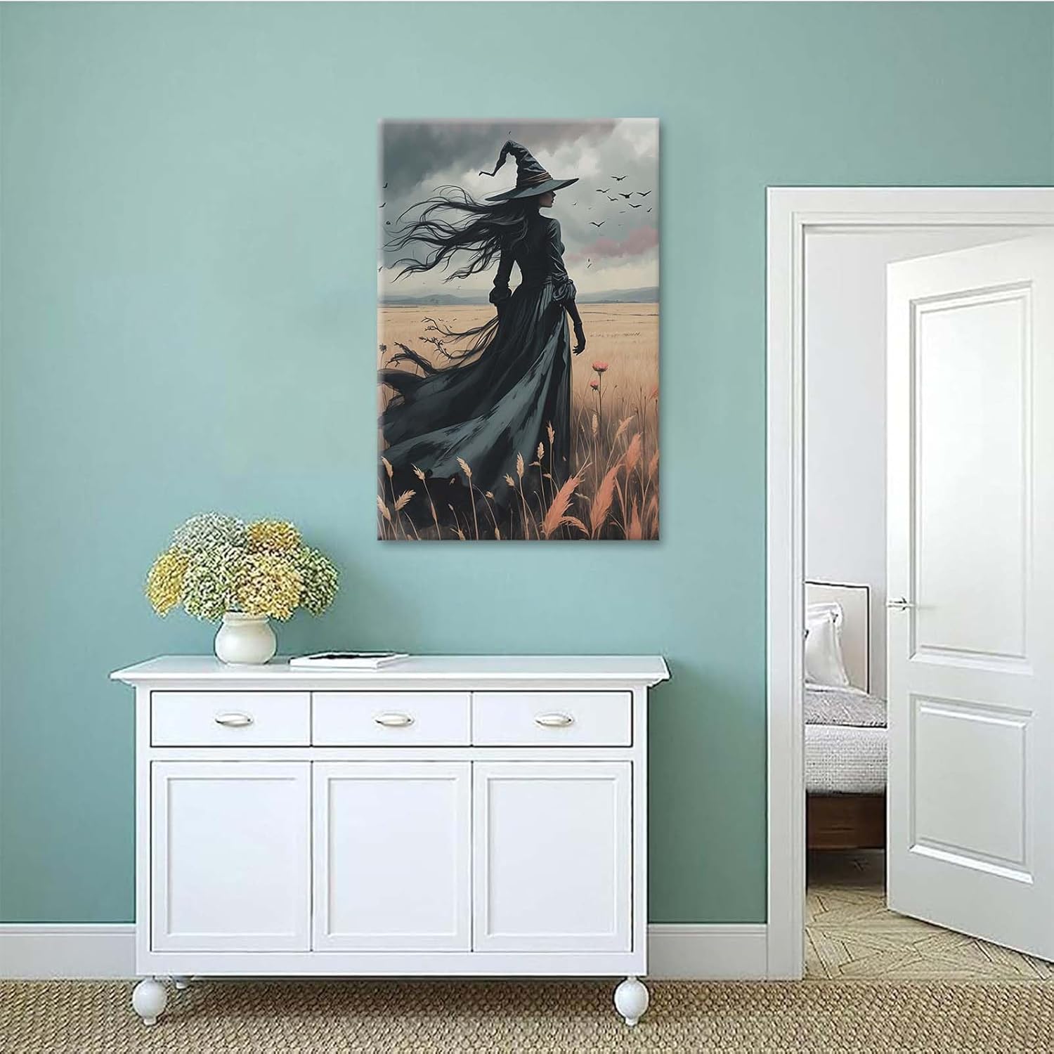 Gothic Decor Canvas Wall Art Witch in Rice Field Halloween Art Decor Print Nature Print Victorian Home Bedroom24x36in Wood Framed