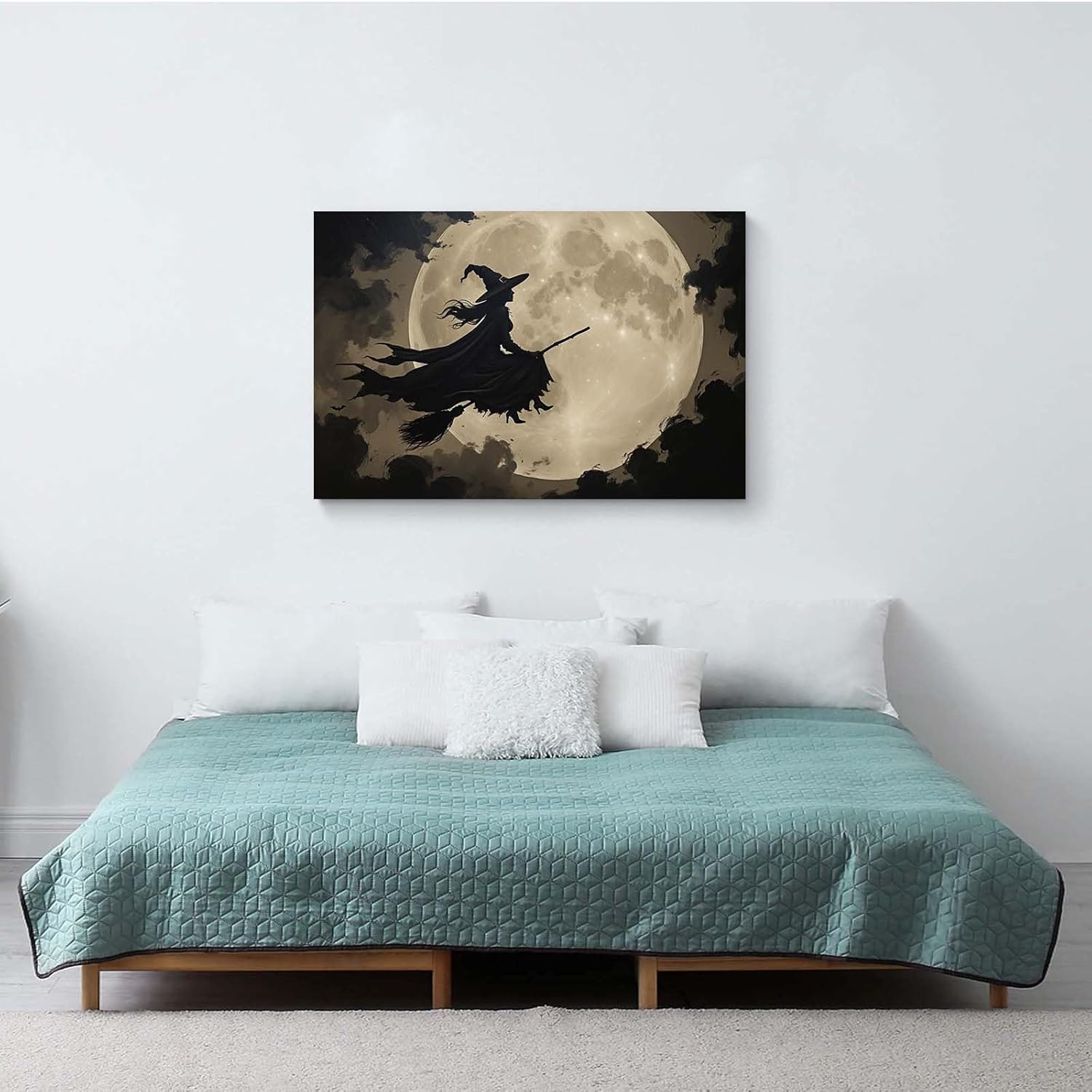 JFHCQJPK Full moon witch silhouette poster witch on magic broom Halloween mural poster decorative mural art suitable for home living room bedroom24x36in Frameless