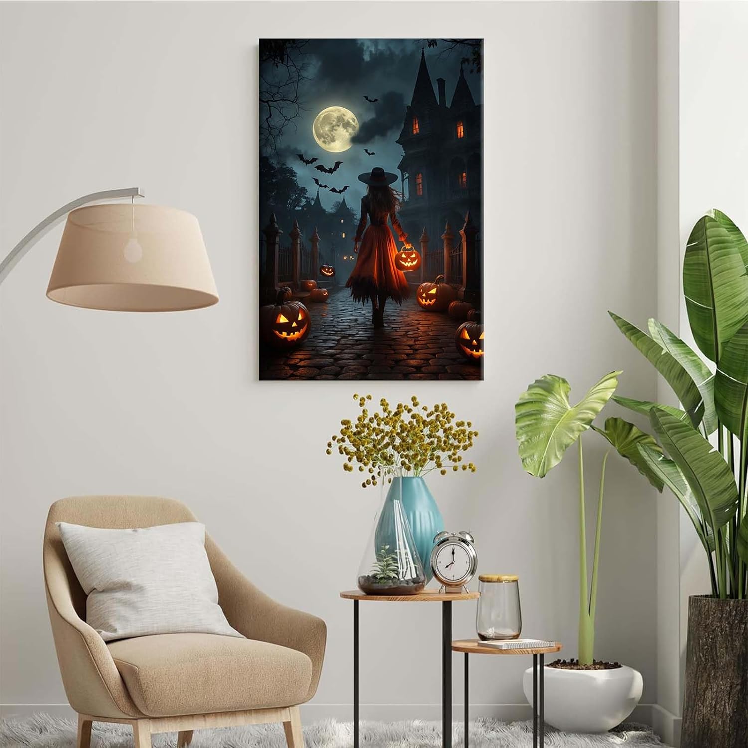 JFHCQJPK Halloween theme poster moonlit autumn night witch vintage poster art print dark college style gothic painting canvas wall decoration bedroom living room ideal gift32x48in Frameless