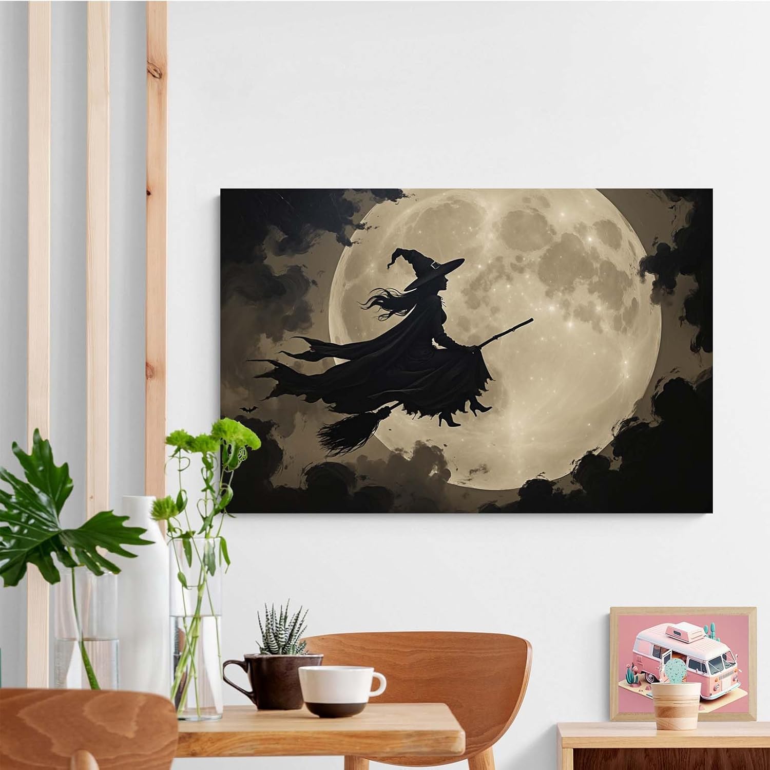 JFHCQJPK Full moon witch silhouette poster witch on magic broom Halloween mural poster decorative mural art suitable for home living room bedroom8x12in Frameless
