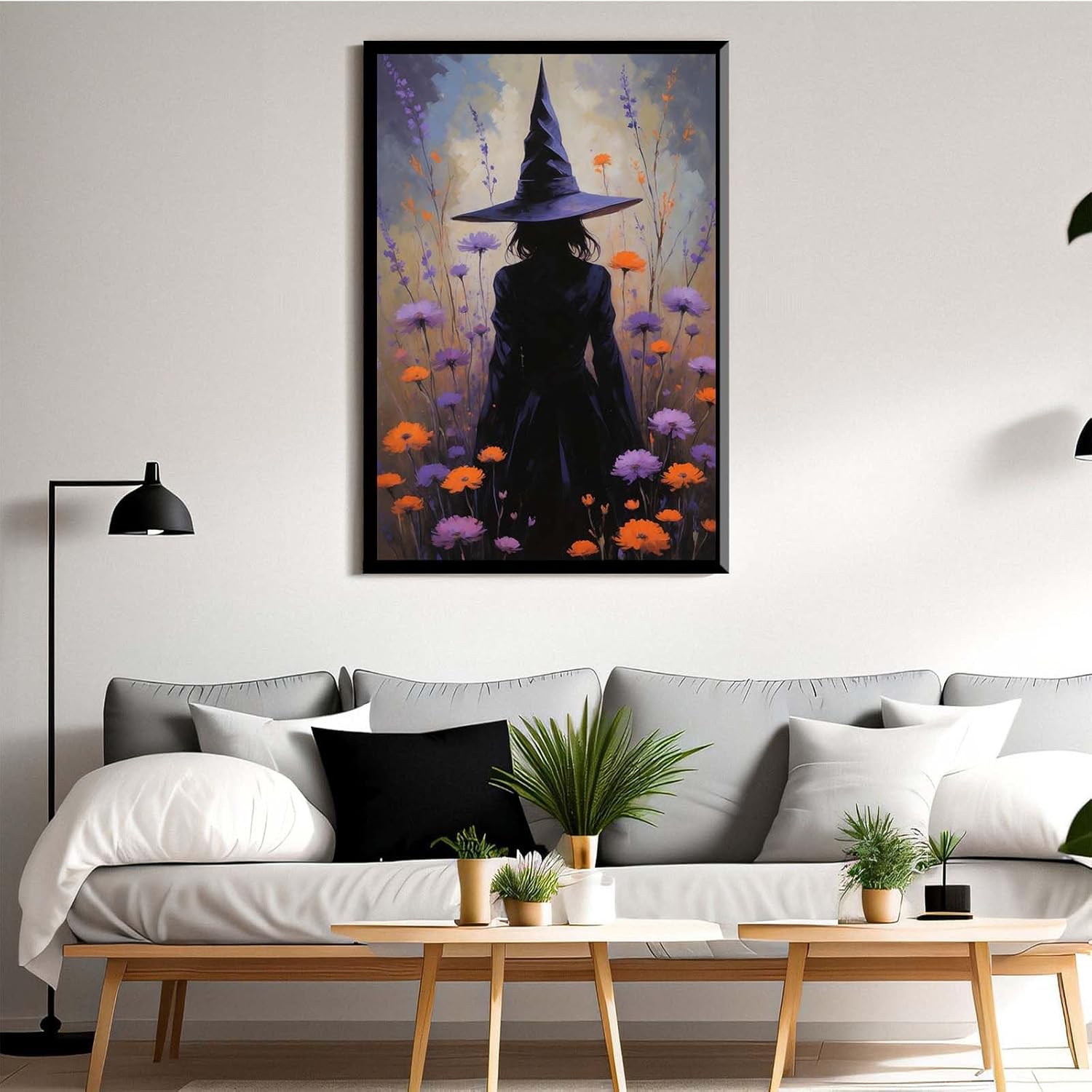 JFHCQJPK Country wildflower witch canvas print halloween mashup art witch purple decoration bohemian elegant art poster12x16in Metal blackFramed