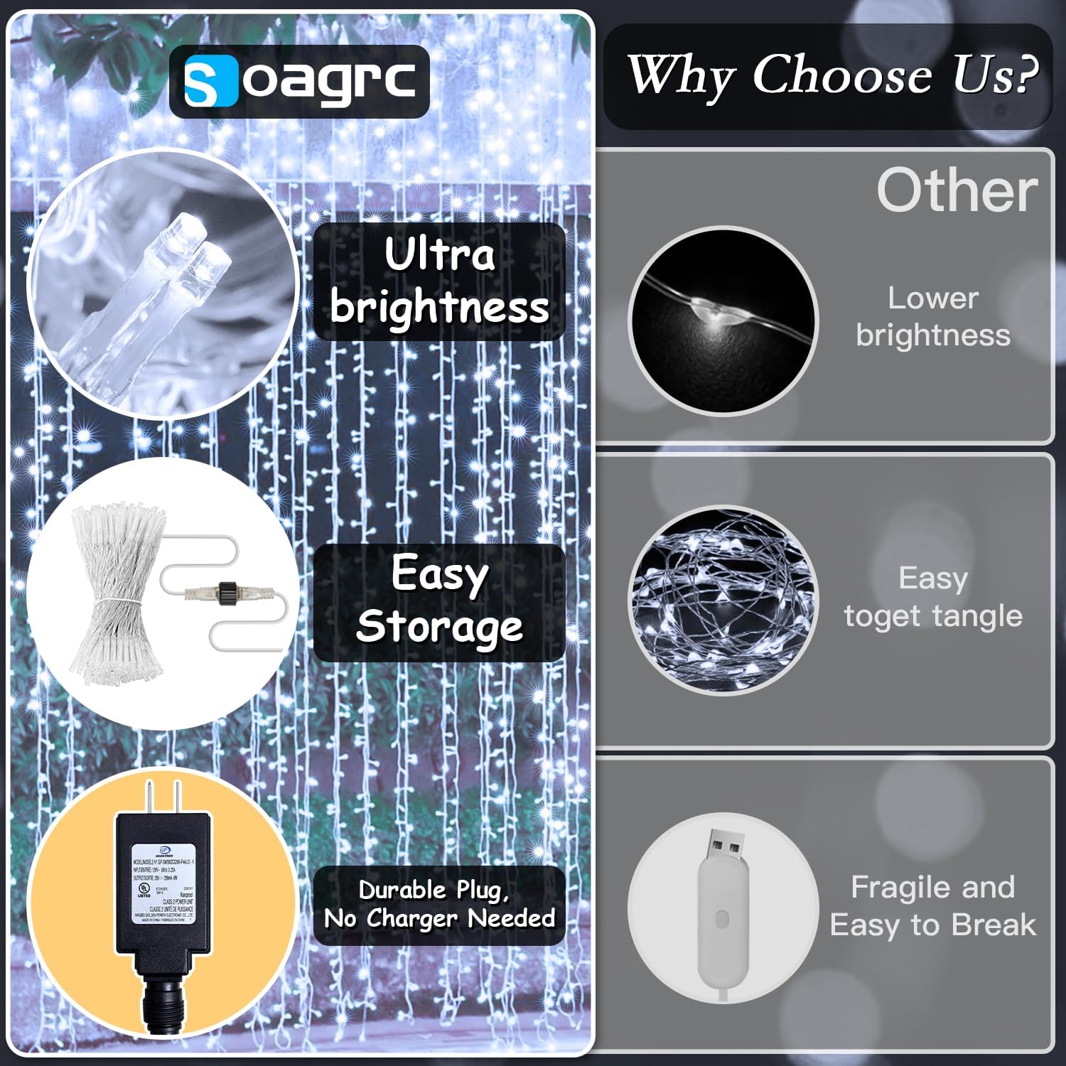 - 9.8FT x 9.8FT Coverage with 300 Brilliant LEDs - Soagrc 9.8FT x 9.8FT curtain features 300 warm white LEDs for a soft, ambient glow. Hang them over your bedframe, behind sheer curtains, or across a large window to create dreamy lighting. Includes a 9.8FT extension cord for easy positioning even in hard to reach outlets