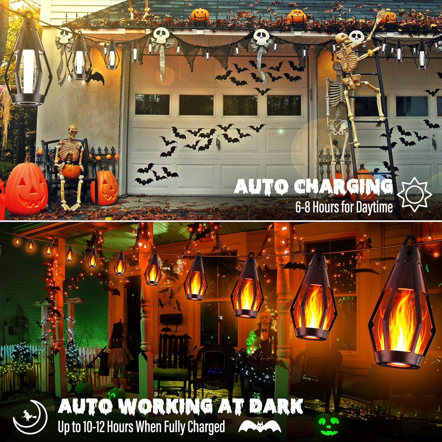 - Flickering Dancing Flames String Lights: iBaycon solar Halloween string lights feature a stunning dancing flame design, offering a realistic flame effect that adds a charming ambiance to any setting