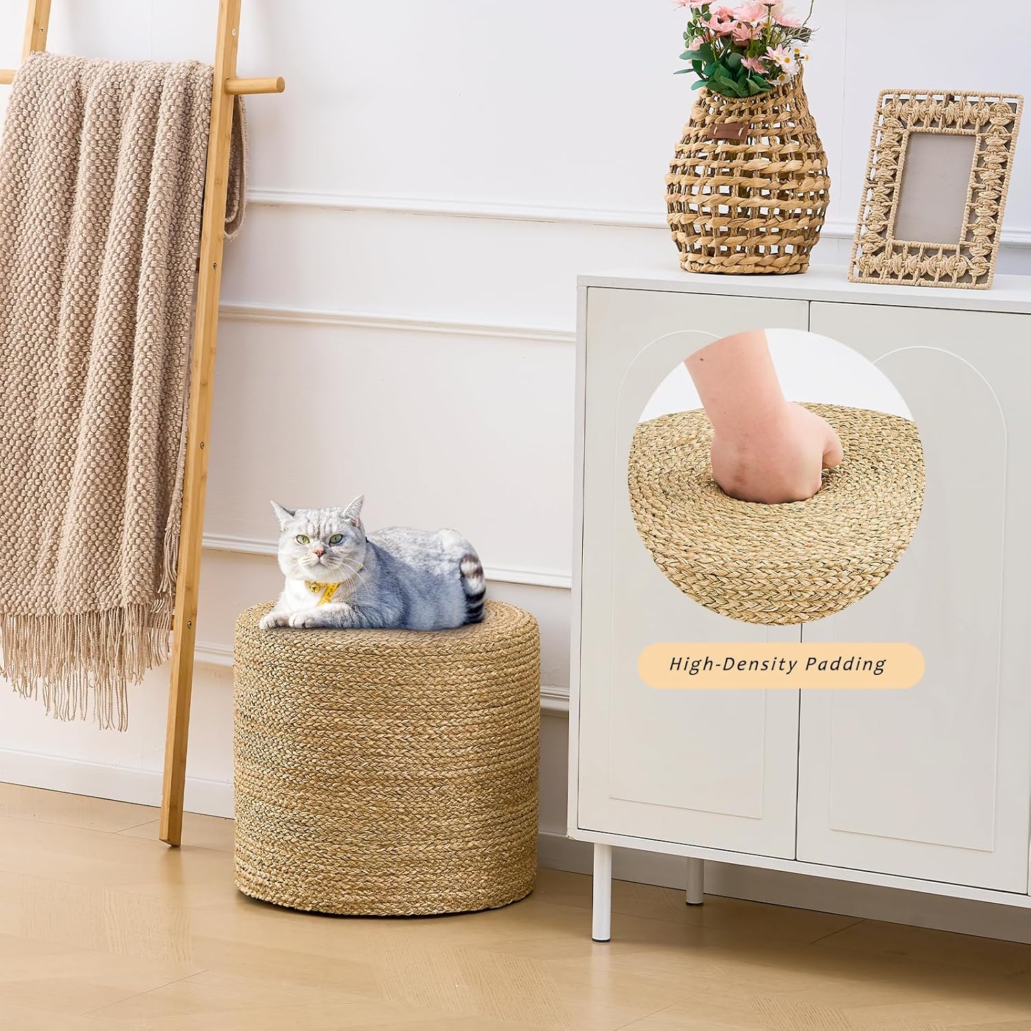 Handwoven Ottoman Pouf, Natural Seagrass Footstool, Round Braided Outdoor Seat with Sturdy Frame, Boho Accent Stool for Patio, Balcony, or Garden (Seagrass)