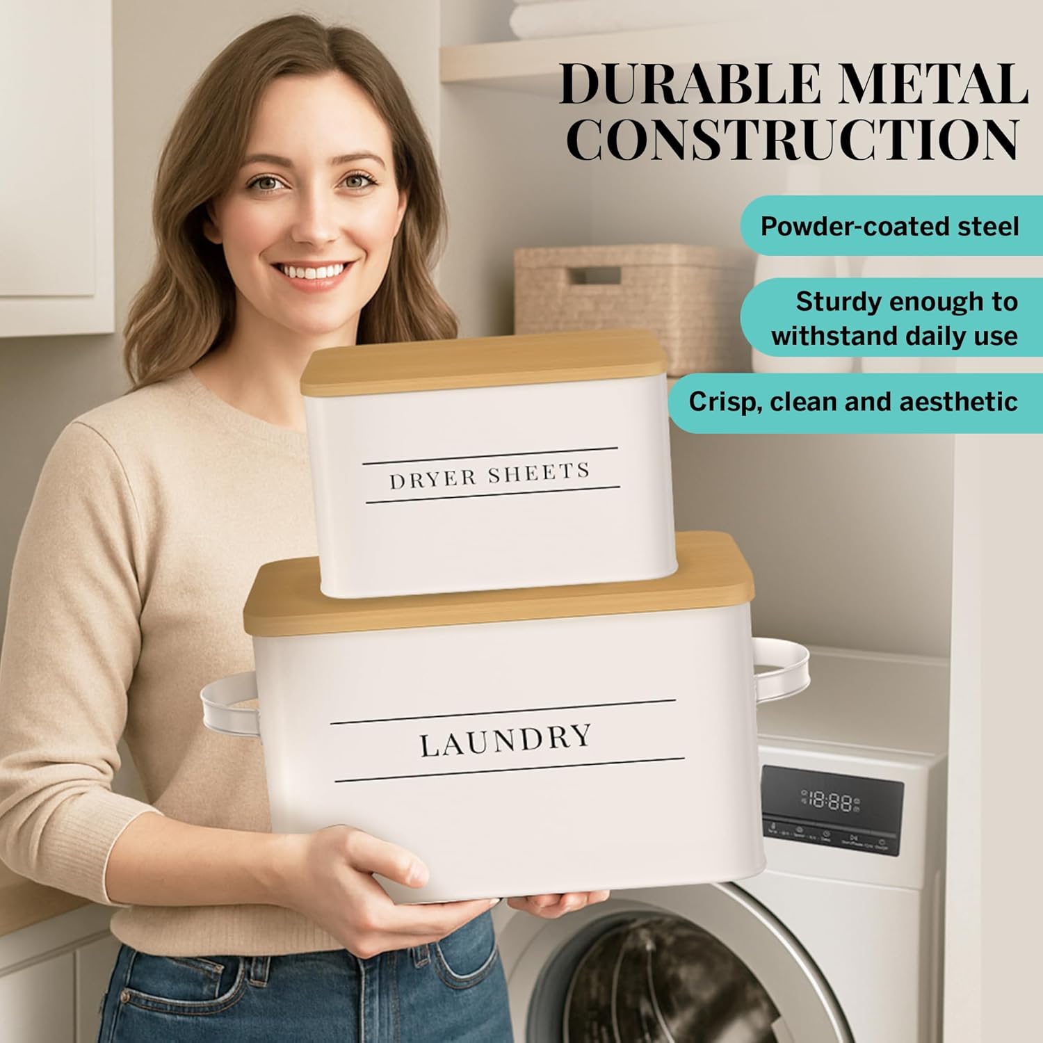 - Functional Lids with Classic Appeal – The lids help retain fragrance and keep contents fresh, all while adding a tailored finishing touch to your laundry organization. These storage bins with lids will be a lovely addition that enhances your laundry room storage.