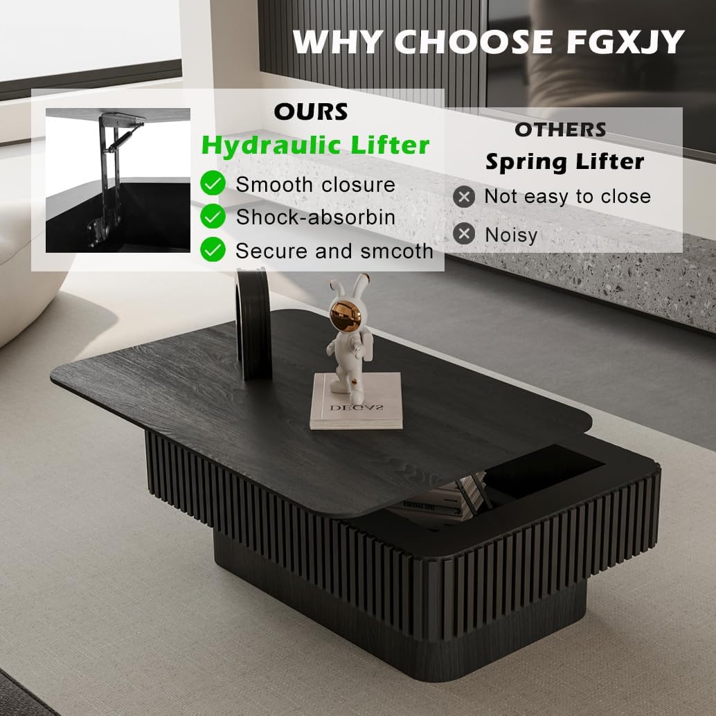 Lift Top Coffee Table with Storage, Solid Wood Coffee Table with Adjustable Height, Fluted Center Table Accent Tea Table for Living Room, Apartment, Office (38.6" Black)