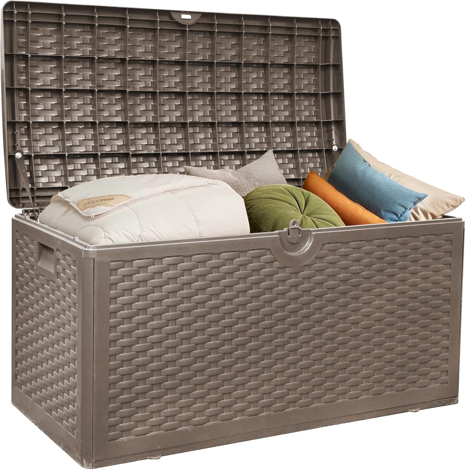 80 Gallon Pro Outdoor Storage Box Waterproof Lockable Resin Deck Box Large, Patio Storage Bin for Pool Accessories Cushion Furniture, Garden Tools, UV-Resistant Outside Delivery Brown