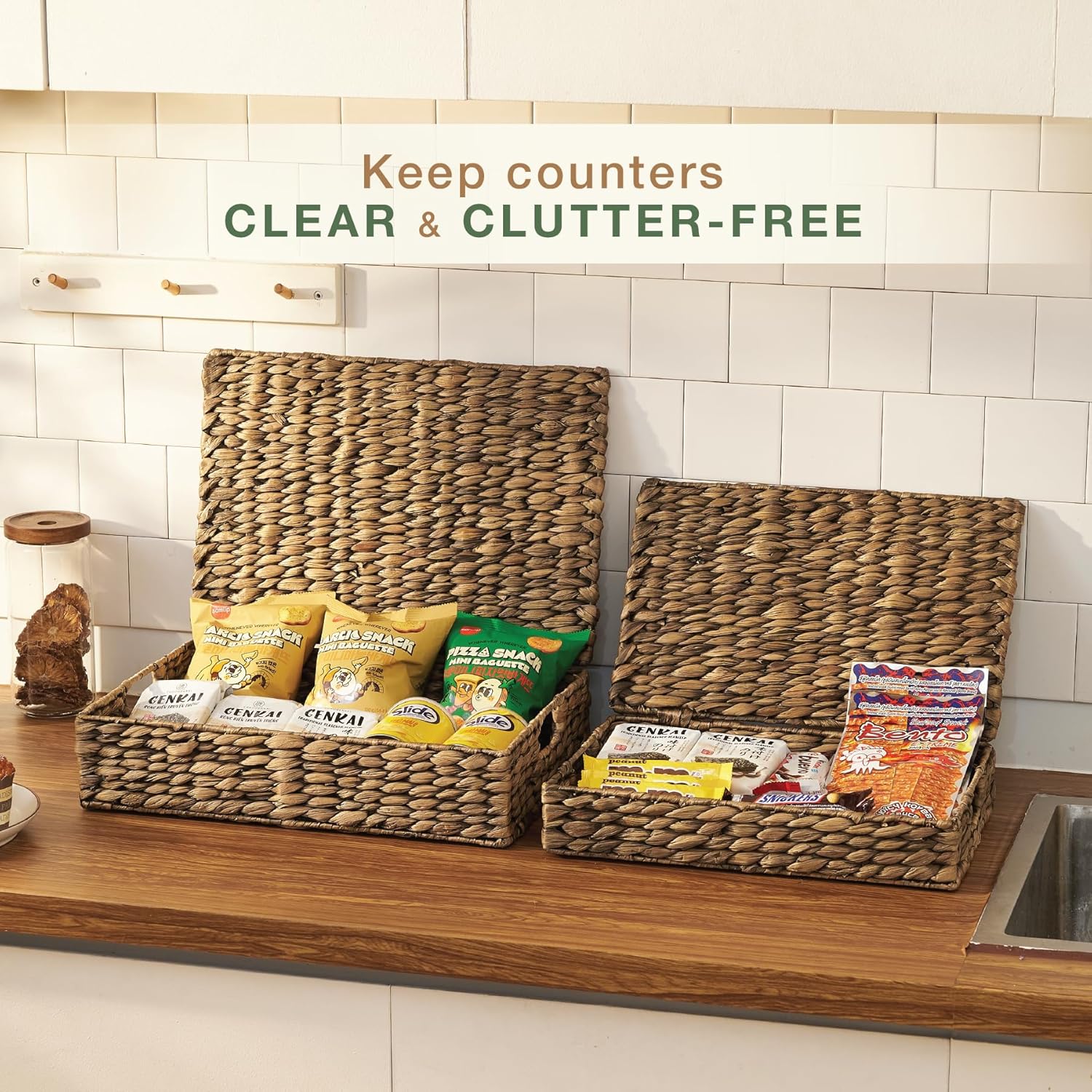 - Versatile Storage Solution: Use these wicker storage baskets with lid to neatly organize mail, office supplies, remote controls, chargers, data cables, makeups, socks, or underwear, keeping your essentials within easy reach but out of sight.