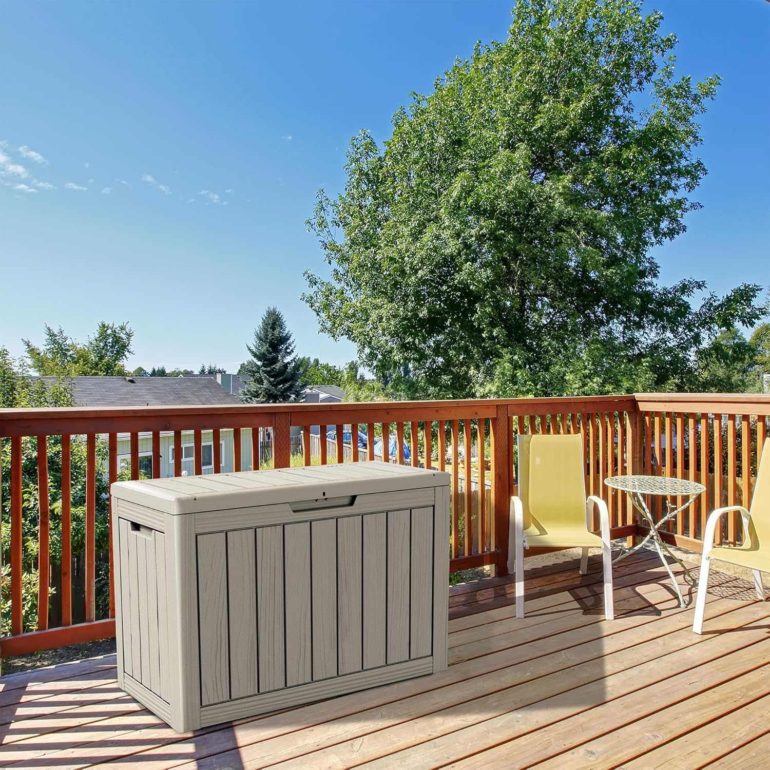- Large Capacity: This 45-gallon deck box offers ample storage space for your outdoor accessories, and it has a 300-pound weight capacity and can be used as a separate patio seat or indoor table.