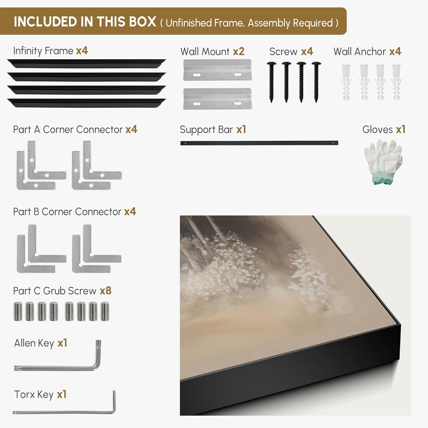 - Assembly Required: The artwork comes with the frame components unassembled. Don’t worry — setup is straightforward and tool-friendly. For best results and accurate alignment, we recommend two people to ensure a smooth assembly and a stable, secure wall mount.