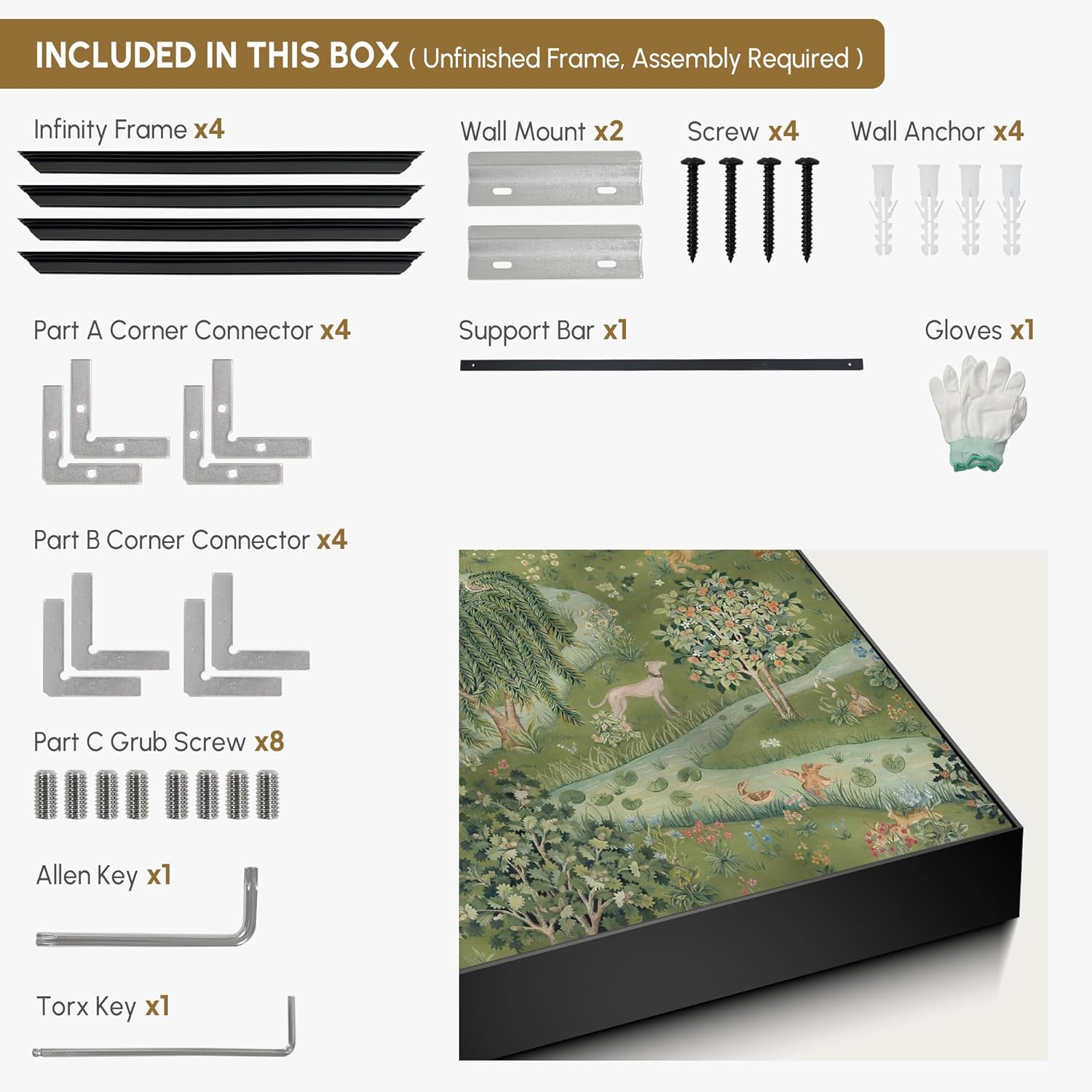 - Assembly Required: The artwork comes with the frame components unassembled. Don’t worry — setup is straightforward and tool-friendly. For best results and accurate alignment, we recommend two people to ensure a smooth assembly and a stable, secure wall mount.