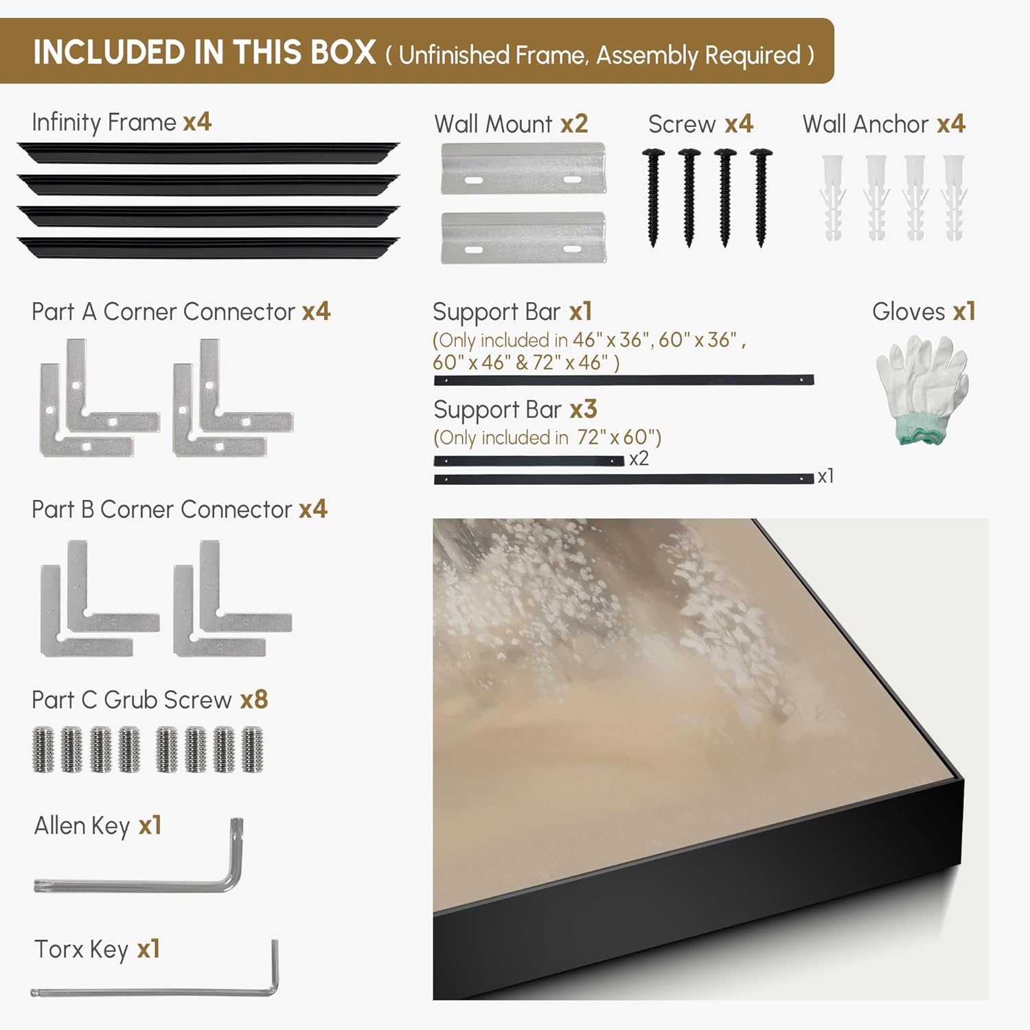 - Assembly Required: The artwork comes with the frame components unassembled. Don’t worry — setup is straightforward and tool-friendly. For best results and accurate alignment, we recommend two people to ensure a smooth assembly and a stable, secure wall mount.