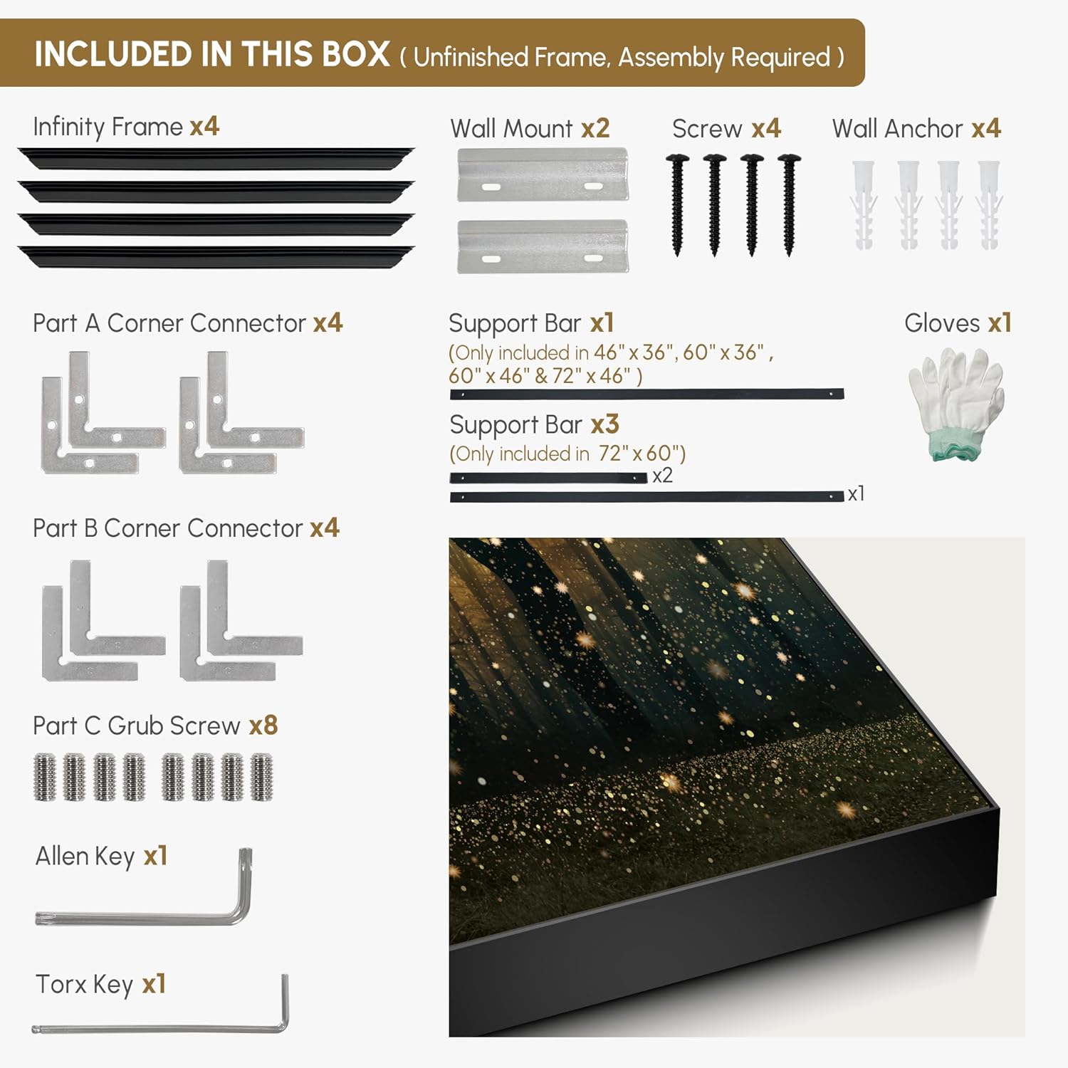 - Assembly Required: The artwork comes with the frame components unassembled. Don’t worry — setup is straightforward and tool-friendly. For best results and accurate alignment, we recommend two people to ensure a smooth assembly and a stable, secure wall mount.