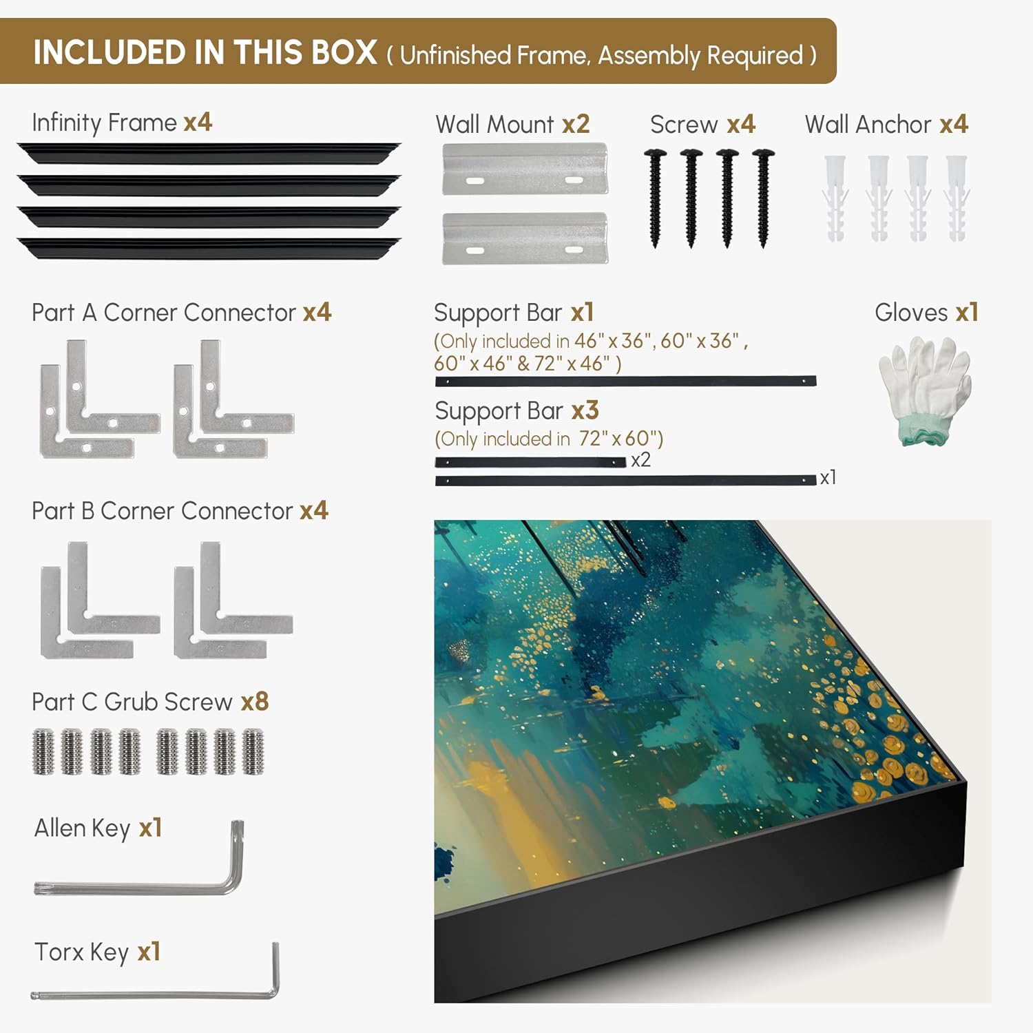 - Assembly Required: The artwork comes with the frame components unassembled. Don’t worry — setup is straightforward and tool-friendly. For best results and accurate alignment, we recommend two people to ensure a smooth assembly and a stable, secure wall mount.