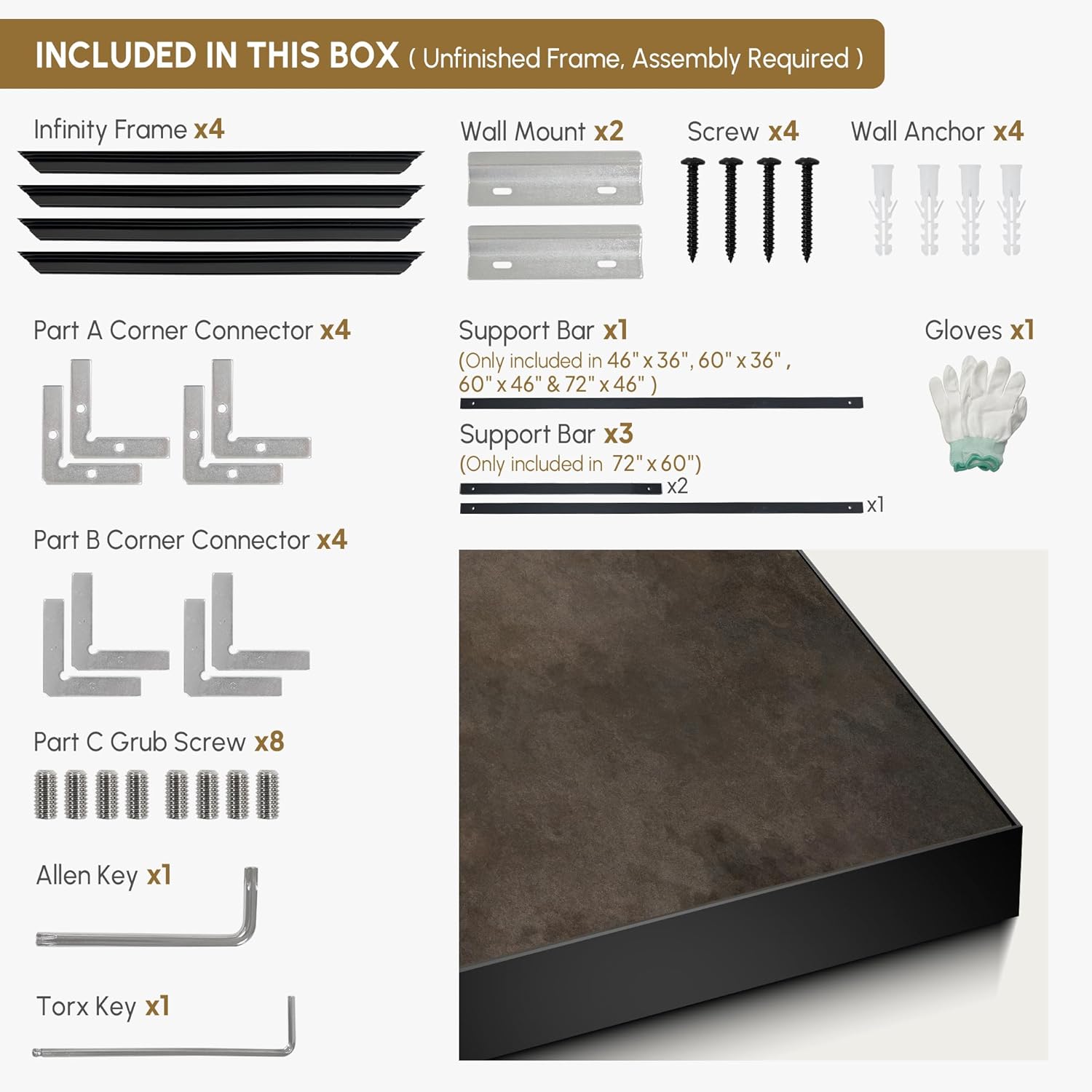 - Assembly Required: The artwork comes with the frame components unassembled. Don’t worry — setup is straightforward and tool-friendly. For best results and accurate alignment, we recommend two people to ensure a smooth assembly and a stable, secure wall mount.