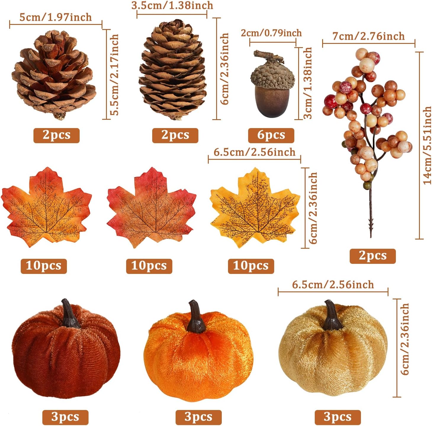 - There are 9 pumpkins with 3 different colors, 30 pieces of assorted maple leaves, 4 pieces of pine cones, 6 pieces acorns, 2 pieces of autumn orange berry stems. There are 51 items in total, which can meet your various needs.